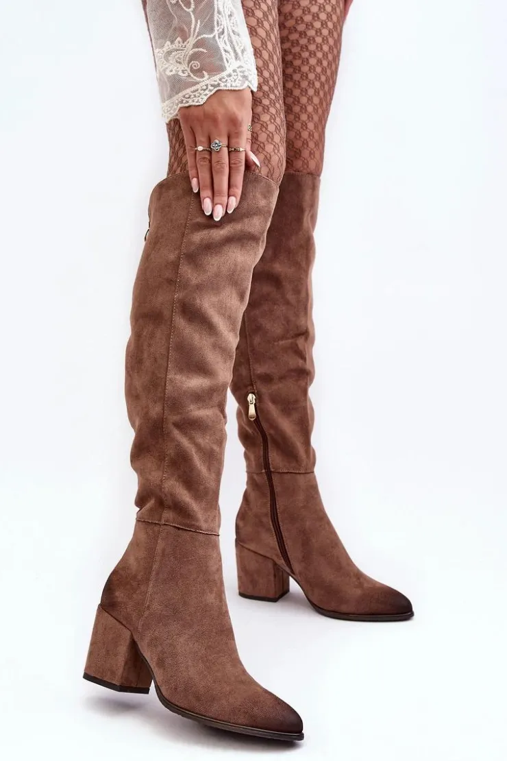 Kozaki damskie z cholewką za kolano. Osadzone na obcasie w postaci słupka. Wykonane z eko zamszu. Noski w szpic optycznie wysmuklą nogi. Model wsuwany z dodatkowym suwakiem na dole cholewki. Usztywniony zapiętek. Przy wyborze rozmiaru prosimy sugerować się tabelą rozmiarów.