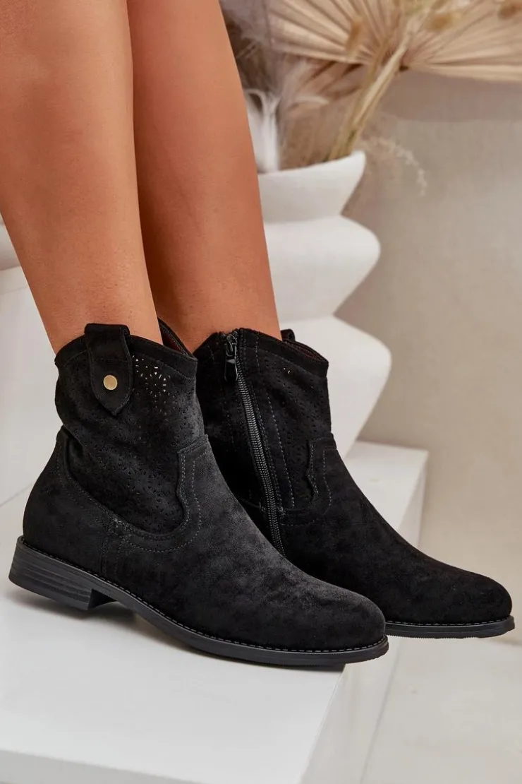 Botki od marki S.Barski, wykonane z eko zamszu, to elegancka propozycja na co dzień. Osadzone na płaskim obcasie, zapewniają wygodę przez cały dzień. Cholewka zdobiona delikatnym ażurowym wzorem dodaje im subtelnego uroku, a zamek ułatwia zakładanie. Idealne do casualowych stylizacji, łączące styl z komfortem. Przy wyborze rozmiaru prosimy sugerować się tabelą rozmiarów.
