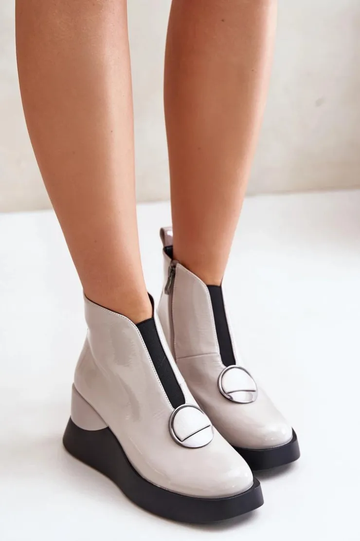 Eleganckie botki damskie osadzone na koturnie i platformie. Wykonane z eko skóry. Zapinane na suwak z boku. Z Przodu elastyczna wstawka oraz ozdoba. Noski zaokrąglone. Środek ocieplony kocem obuwniczym. Model ten z pewnością dopełni wiele jesienno-zimowych stylizacji! Przy wyborze rozmiaru prosimy sugerować się tabelą rozmiarów.