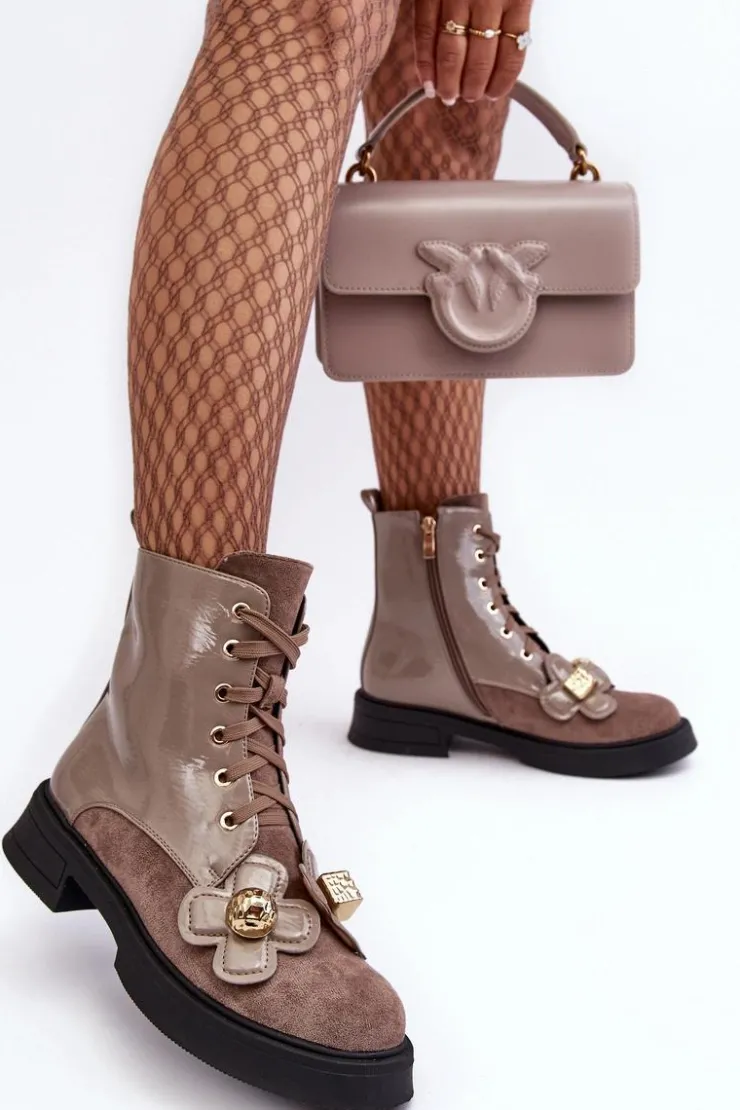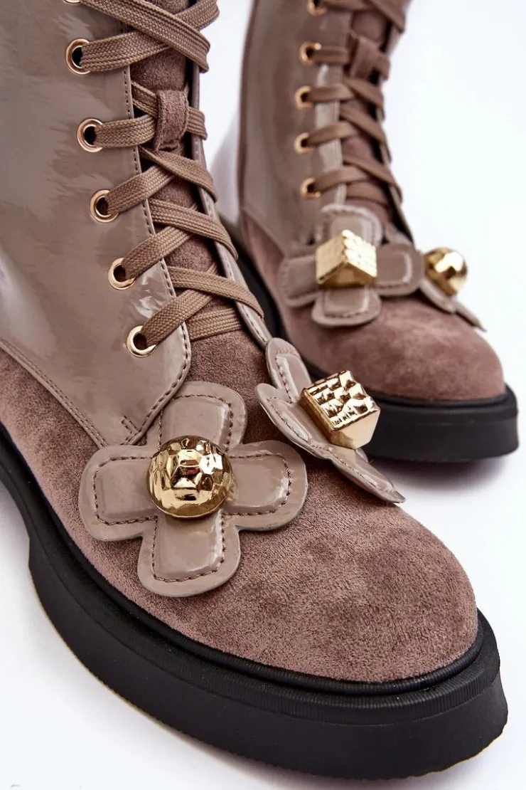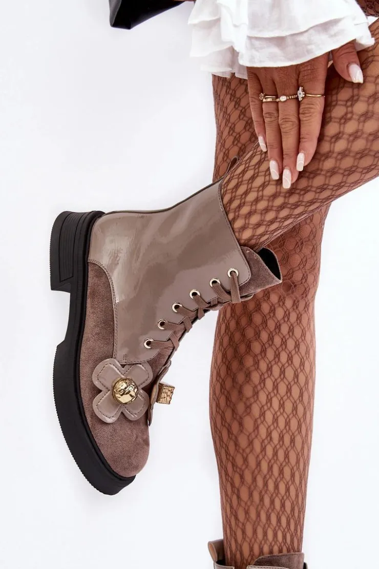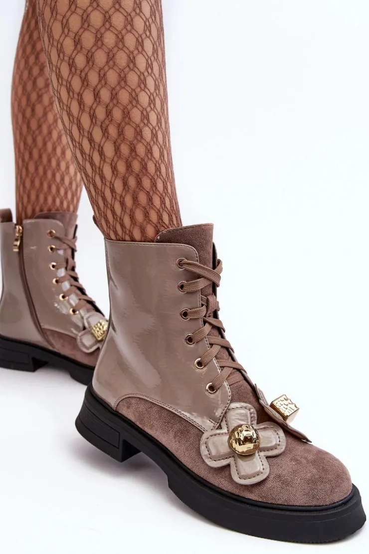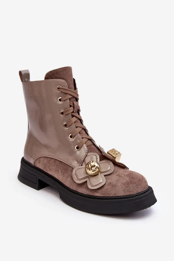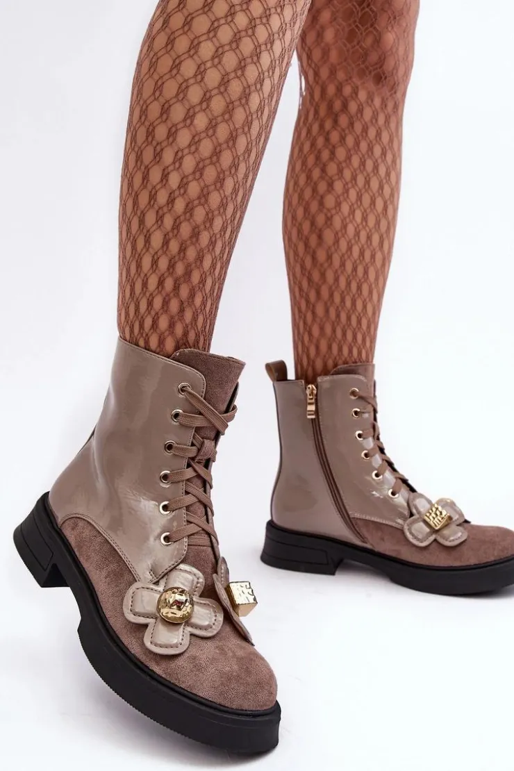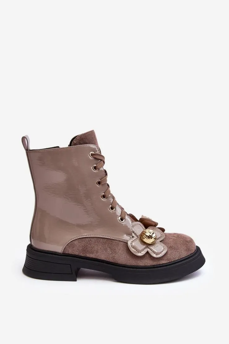 Damskie botki zostały wykonane z wysokiej jakości eko skóry. Osadzono je na płaskim obcasie i platformie. Z przodu posiadają sznurowanie, natomiast z boku cholewki znajduje się suwak ułatwiający zakładanie obuwia. Środek ocieplono miłym w dotyku kocem obuwniczym. Dodatkowo model ten ozdobiono kwiatami z materiału i tworzywa sztucznego. Ten model na pewno wykorzystasz w wielu stylizacjach! Przy wyborze rozmiaru prosimy sugerować się tabelą rozmiarów.