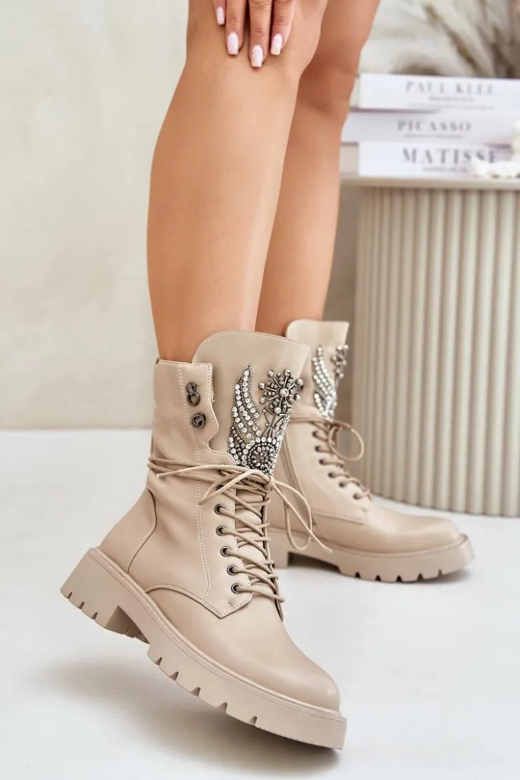 Ocieplane botki workery wykonane z eko skóry to stylowa i funkcjonalna propozycja na chłodniejsze dni. Osadzone na płaskim obcasie, zapewniają komfort noszenia, a dzięki zapięciu na zamek i sznurowaniu łatwo je dopasować do stopy. Zaokrąglone noski dodają klasycznego wyglądu, a zdobienie na języku wprowadza modny akcent. To idealny wybór dla osób ceniących wygodę i oryginalny design w codziennych stylizacjach. Przy wyborze rozmiaru prosimy sugerować się tabelą rozmiarów.