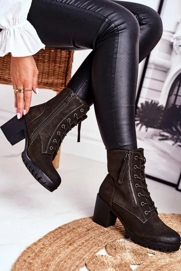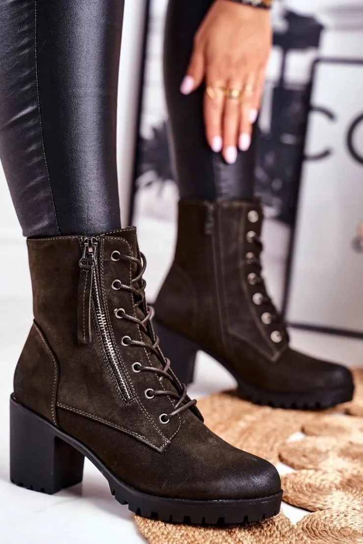 Damskie buty S.Barski Botki Sznurowane|Botki Na Słupku*Botki Damskie Na Słupku Ocieplane Khaki Vimen