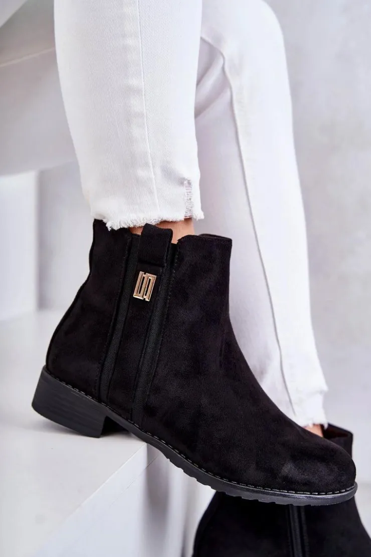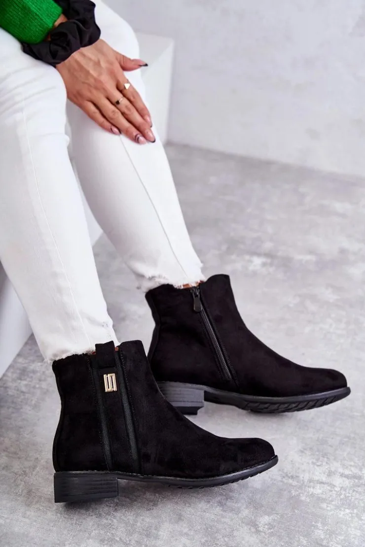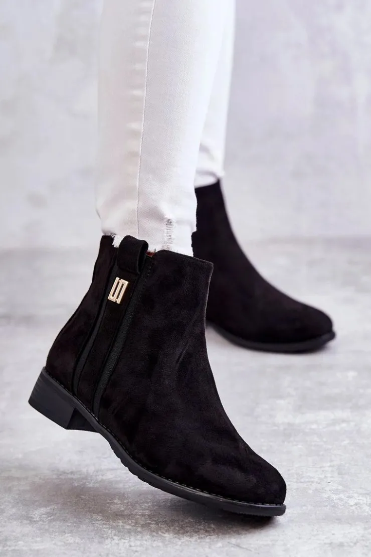 Klasyczne botki wykonane z miłego w dotyku eko zamszu. Posiadają ozdobny emblemat z boku cholewki. Osadzone na płaskim obcasie. Botki te posiadają zaokrąglony nosek oraz usztywniany zapiętek. Wnętrze zostało ocieplone kocem obuwniczym. Z boku cholewki znajduje się suwak ułatwiający zakładanie obuwia. Koniecznie sprawdź także pozostałe modele botków dostępnych w naszej ofercie! Przy wyborze rozmiaru prosimy sugerować się tabelą rozmiarów.