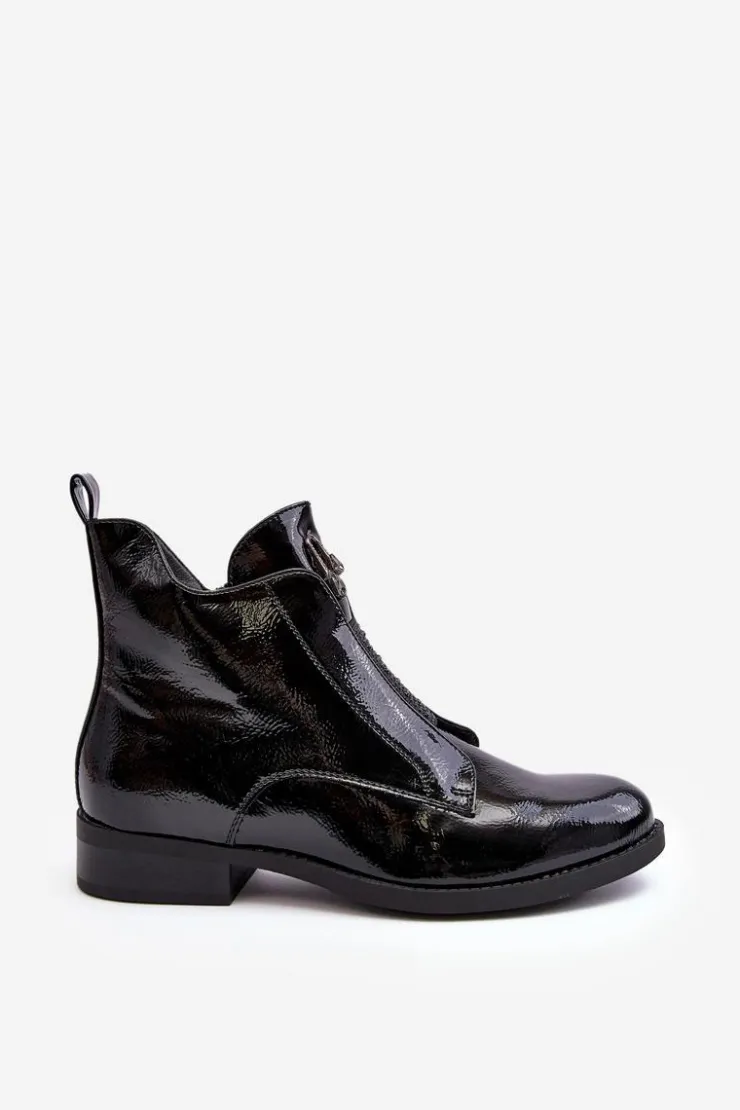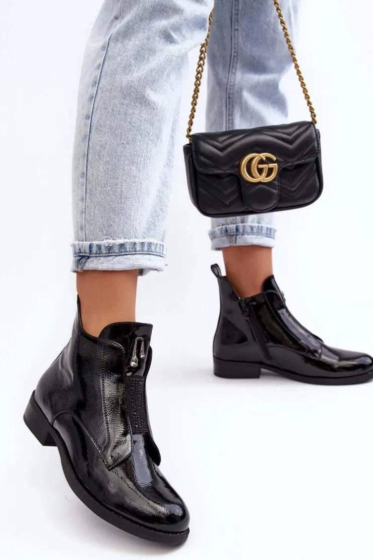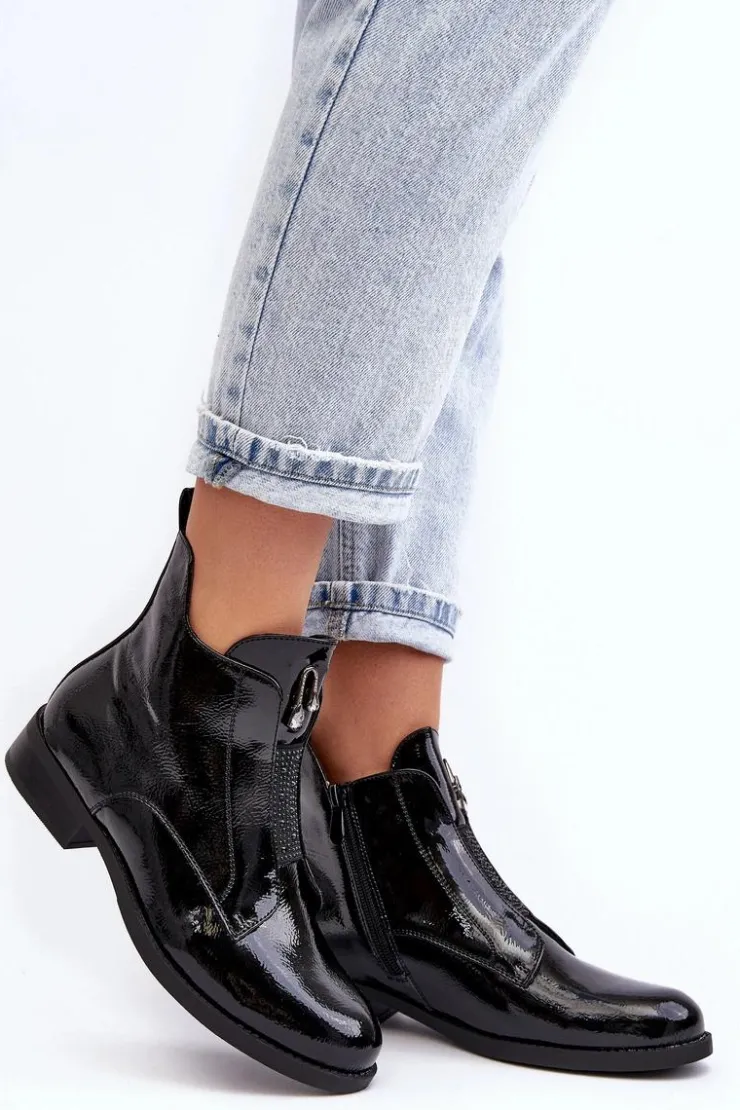 Botki damskie marki S.Barski wykonane z eko skóry. Osadzone na płaskim obcasie, który zapewni stabilność na każdym kroku. Środek ocieplony kocem obuwniczym. Noski zaokrąglone. Model zapinany na suwak. Cholewka za kostkę. Usztywniony zapiętek. Przy wyborze rozmiaru prosimy sugerować się tabelą rozmiarów.