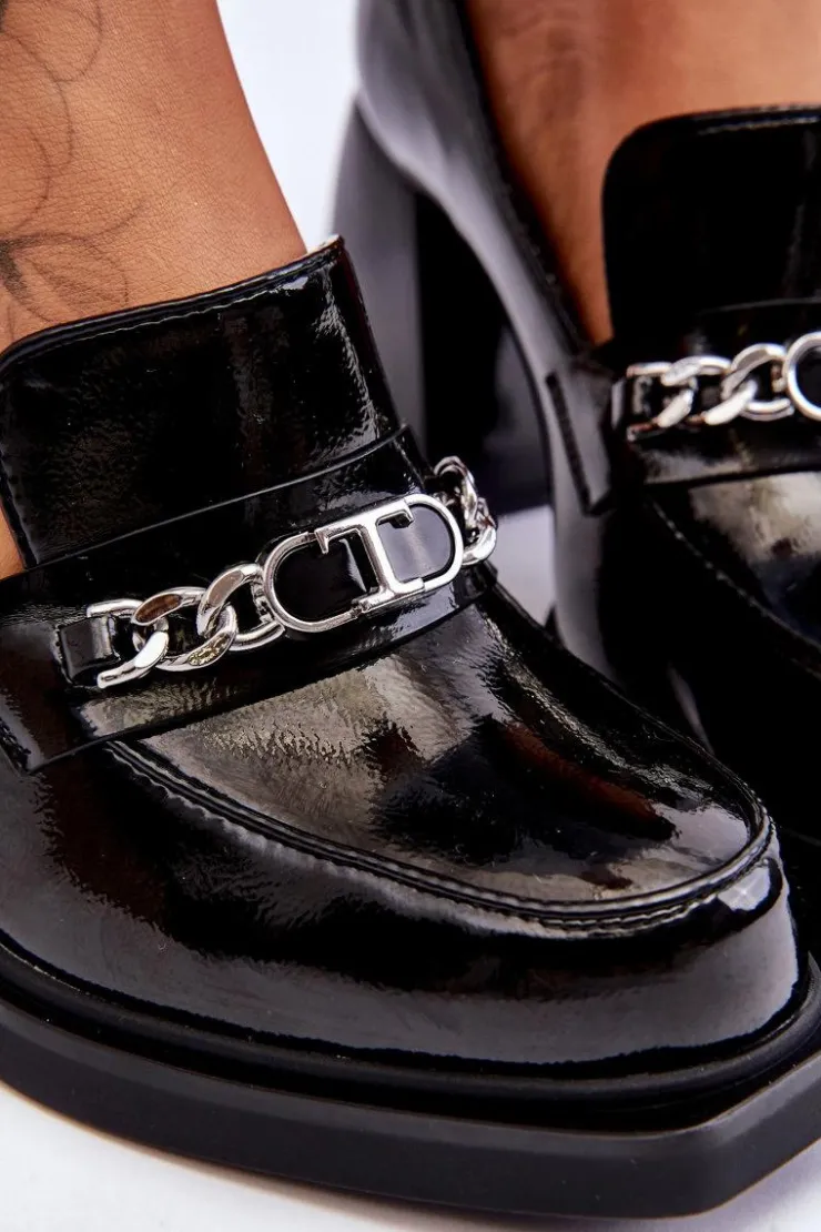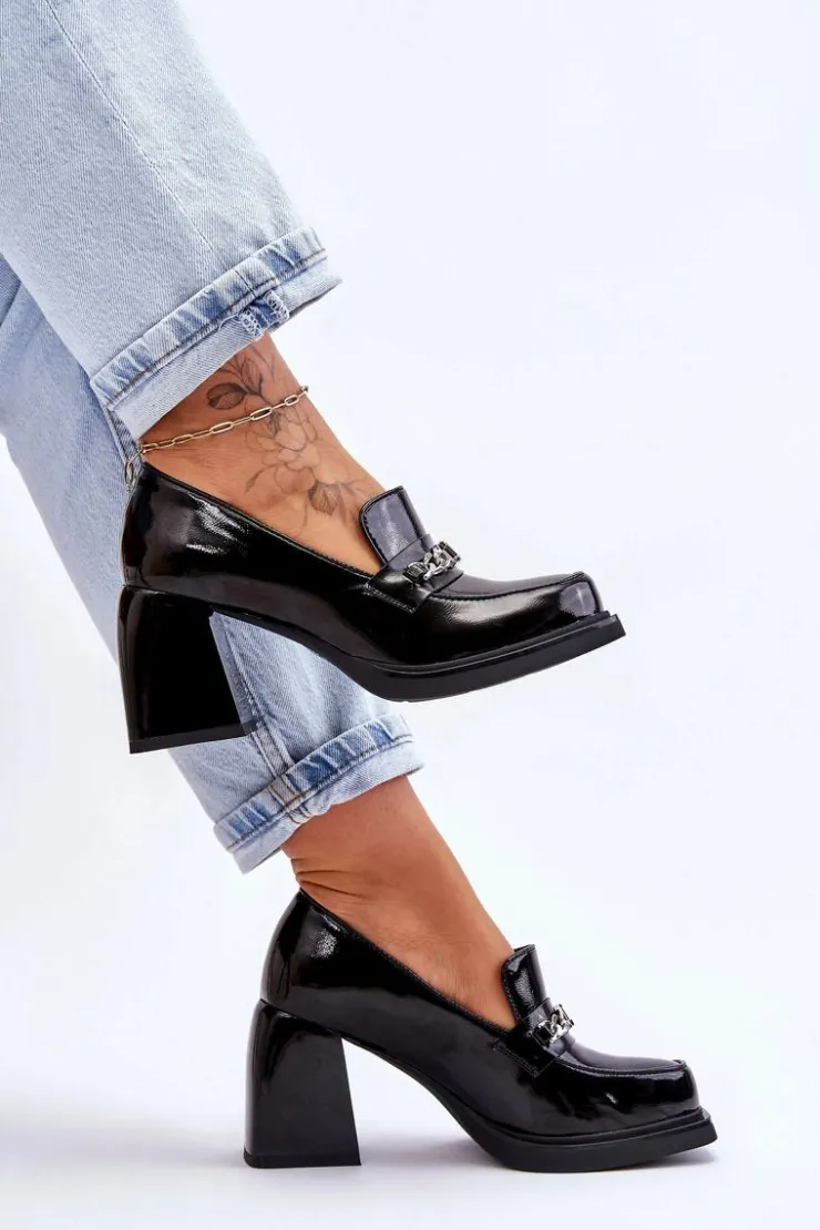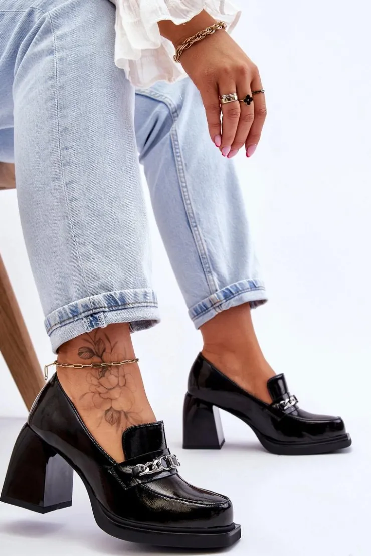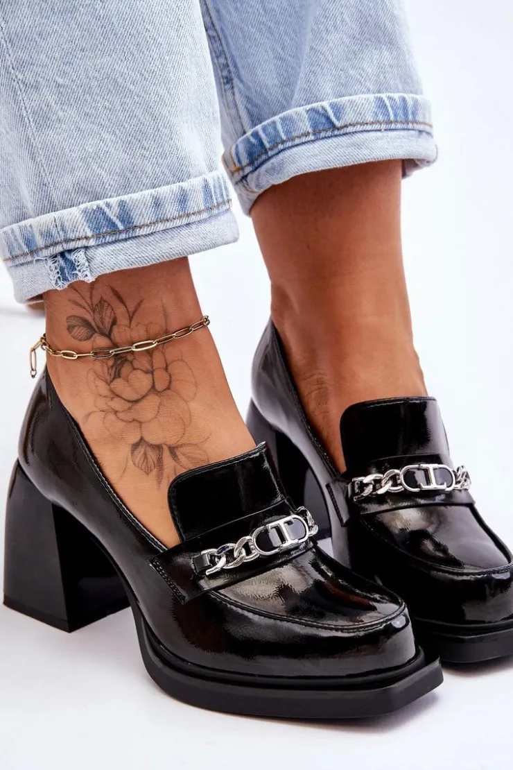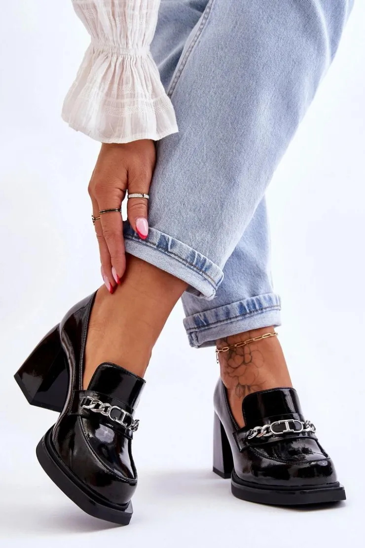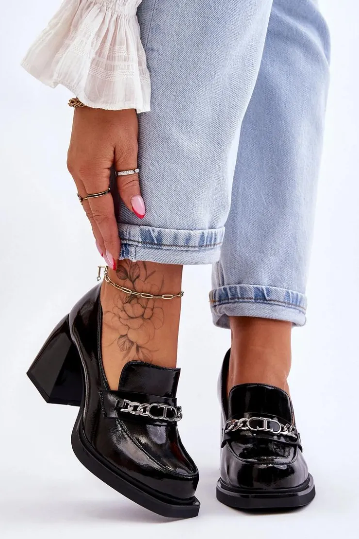 Wygodne czółenka dla każdej kobiety ceniącej sobie komfort i piękno na każdym kroku! Te modne czółenka zostały wykonane z eko skóry i ozdobione łańcuszkiem i emblematem. Osadzono je na delikatnej platformie oraz masywnym obcasie w postaci klocka. Dodatkowo posiadają usztywniany zapiętek. Koniecznie powinnaś mieć ten model w swojej szafie! Przy wyborze rozmiaru prosimy sugerować się tabelą rozmiarów.