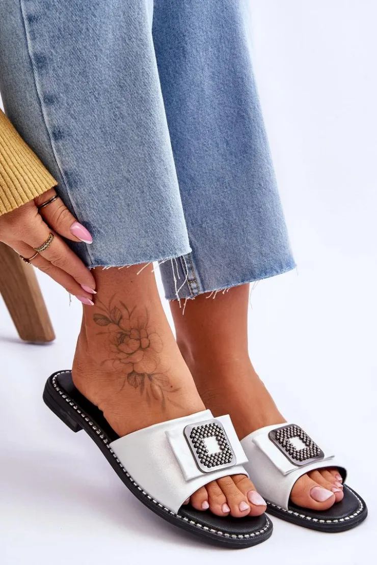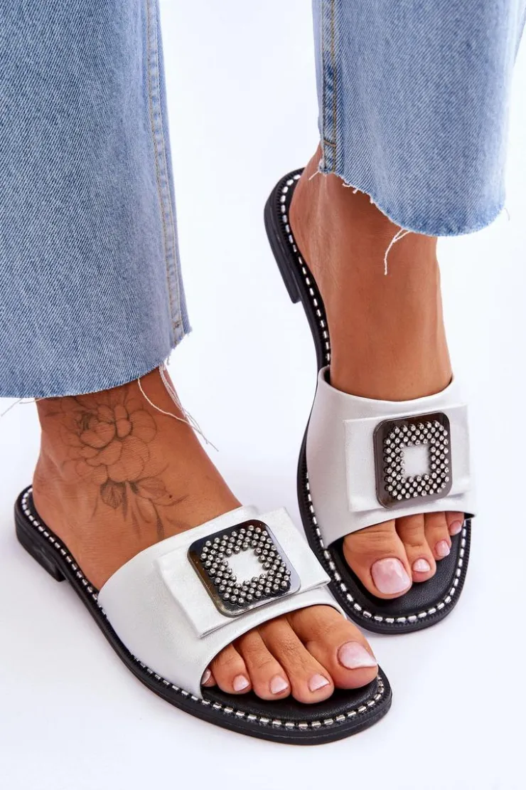 Klasyczne klapki świetnie sprawdzą się w sezonie letnim! Są wygodne, dzięki wkładce Comfort wykonanej z eko skóry. Model ten został wykonany z eko skóry. Posiada na pasku kwadratową ozdobę wykonaną z tworzywa z dżetami. Klapki osadzono na płaskim obcasie. Koniecznie powinnaś je mieć! Przy wyborze rozmiaru prosimy sugerować się tabelą rozmiarów.
