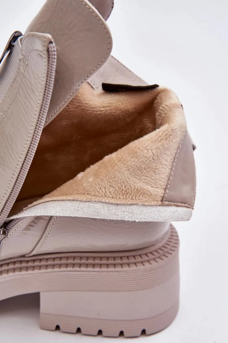 Botki damskie marki S.Barski osadzone na płaskim masywnym obcasie i platformie. Wykonane z eko skóry. Model zapinany na suwak z boku. Na cholewce elastyczna wstawka i ozdoba z tworzywa sztucznego. Noski zaokrąglone. Środek ocieplony kocem obuwniczym. Usztywniony zapiętek. Przy wyborze rozmiaru prosimy sugerować się tabelą rozmiarów.