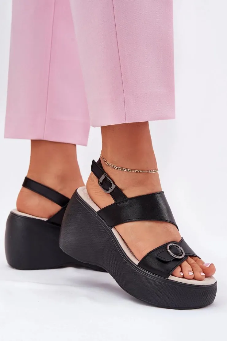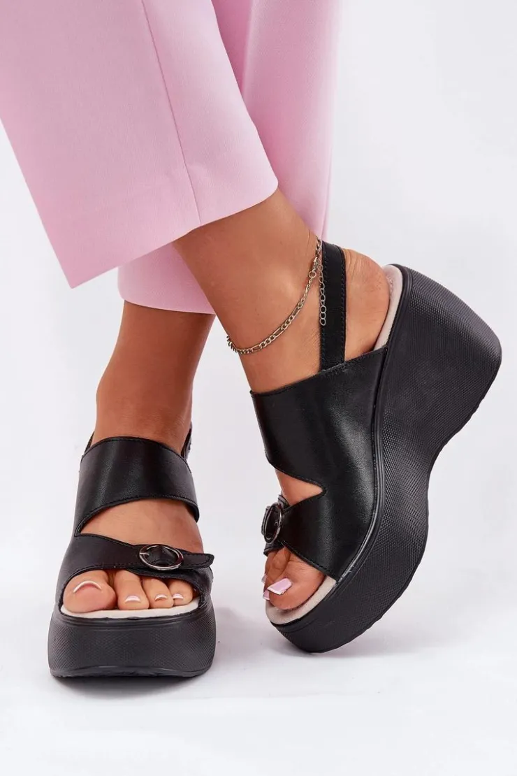 Damskie sandały wykonane z naturalnej skóry to elegancka propozycja na letnie dni. Osadzone na platformie i koturnie, zapewniają stabilność i wygodę przez cały dzień. Regulowany paseczek z klamrą z przodu umożliwia idealne dopasowanie do stopy, a miękka skórzana wkładka gwarantuje komfort. Te sandały łączą elegancję z funkcjonalnością, stanowiąc doskonały wybór do stylowych letnich stylizacji. Przy wyborze rozmiaru prosimy kierować się tabelą rozmiarów.