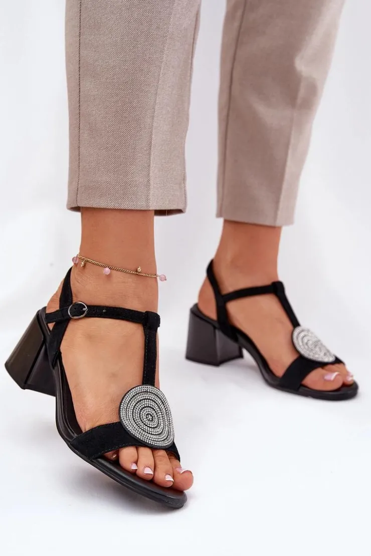 Damskie sandały z naturalnej skóry, osadzone na obcasie słupku, które łączą elegancję z wygodą. Zapinane na sprzączkę z regulowanym paskiem, zapewniają idealne dopasowanie do stopy. Z przodu butów znajduje się ozdobny detal, który przyciąga wzrok i nadaje im wyjątkowego charakteru. Te sandały będą doskonałym wyborem na specjalne okazje, doskonale komponując się z sukienkami lub eleganckimi spodniami. Przy wyborze rozmiaru prosimy sugerować się poniższą tabelą rozmiarów.