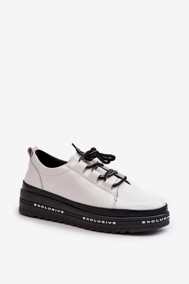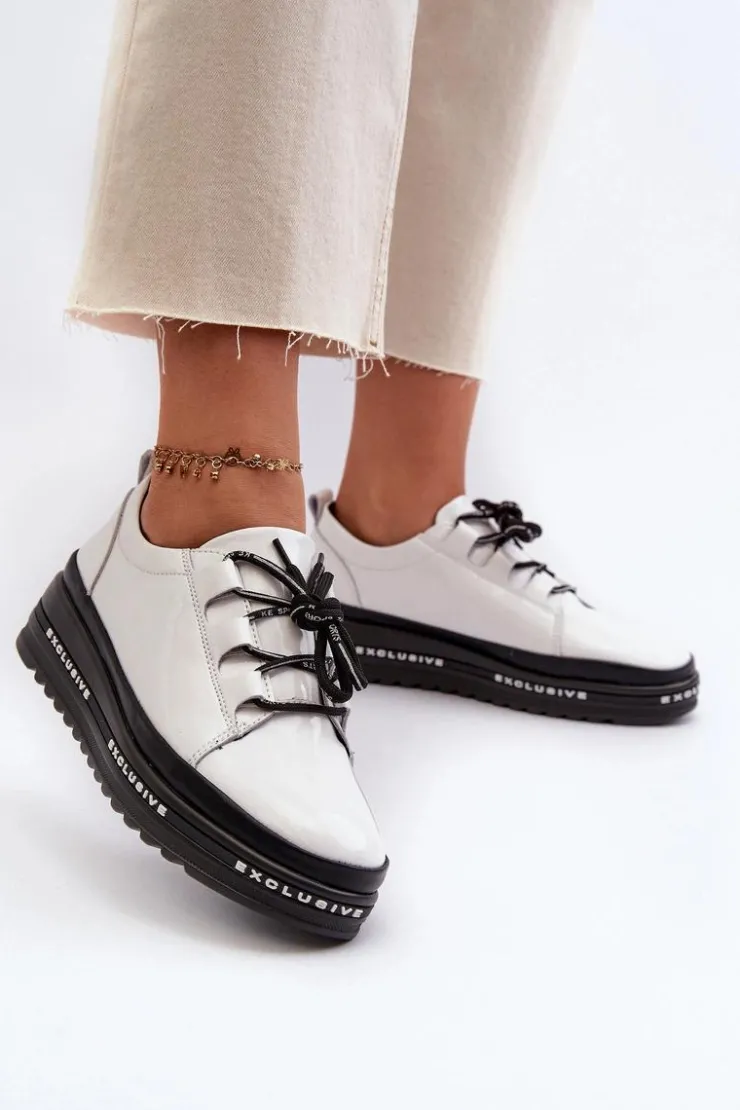 Modne, a zarazem wygodne damskie buty sportowe zostały wykonane z naturalnej skóry. Model ten posiada sznurowadła z ozdobnym napisem. Sneakersy zostały osadzone na platformie. Obuwie to posiada naturalną, skórzaną wkładkę Comfort. Świetny model do wielu stylizacji! Koniecznie powinnaś je mieć! Przy wyborze rozmiaru prosimy sugerować się tabelą rozmiarów.