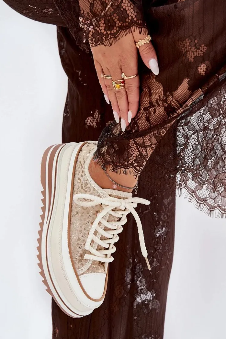 Trampki damskie wykonane z materiału tekstylnego. Osadzone na masywnej platformie, która wysmukli sylwetkę. Model z grubszym sznurowaniem, co dodaje im wyjątkowego charakteru. Miękka wkładka zapewnia komfort i amortyzację na każdym kroku. Doskonałe do codziennych stylizacji, te trampki oferują zarówno styl, jak i funkcjonalność. Przy wyborze rozmiaru prosimy sugerować się tabelą rozmiarów.