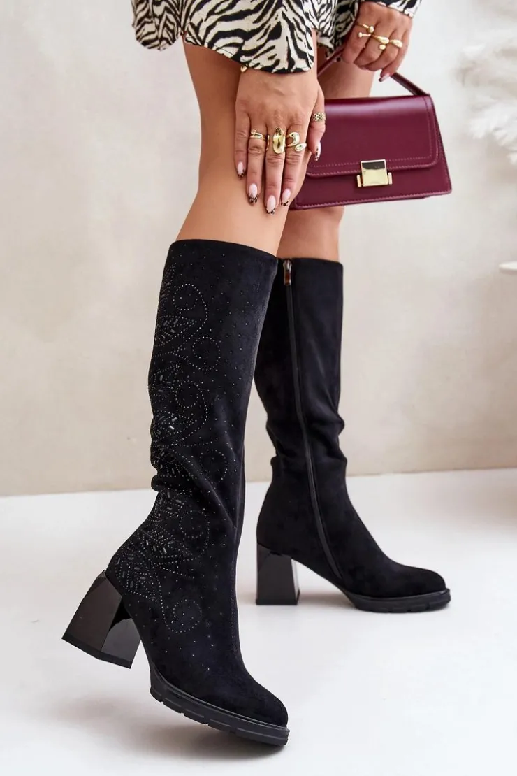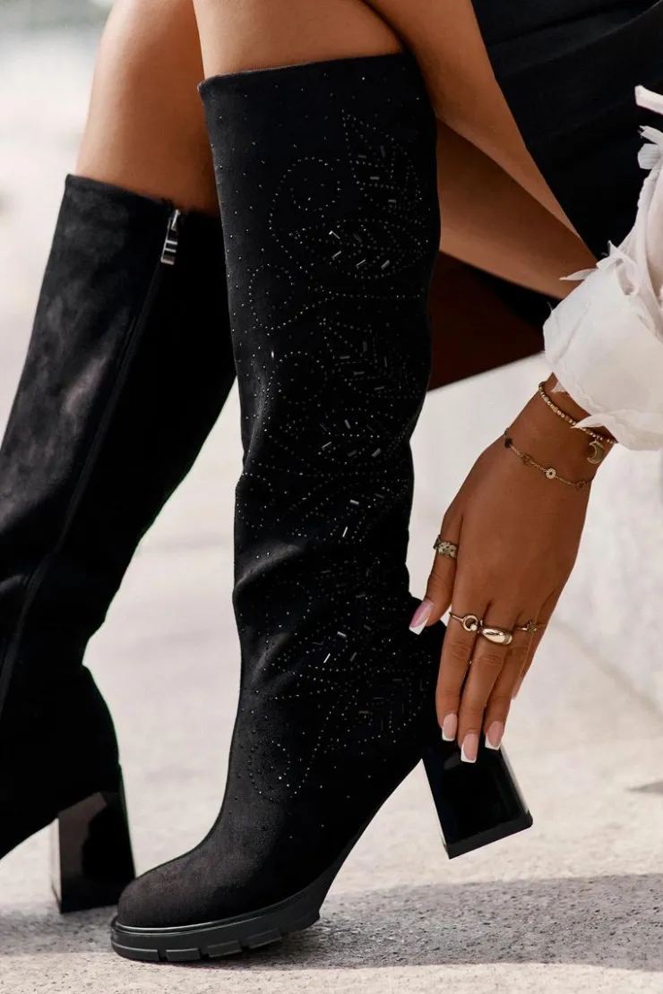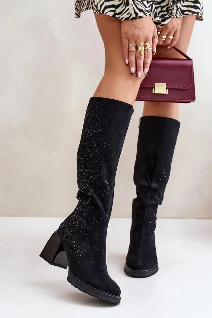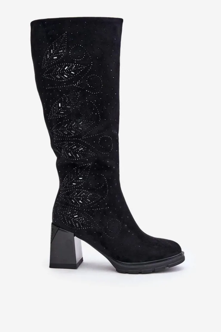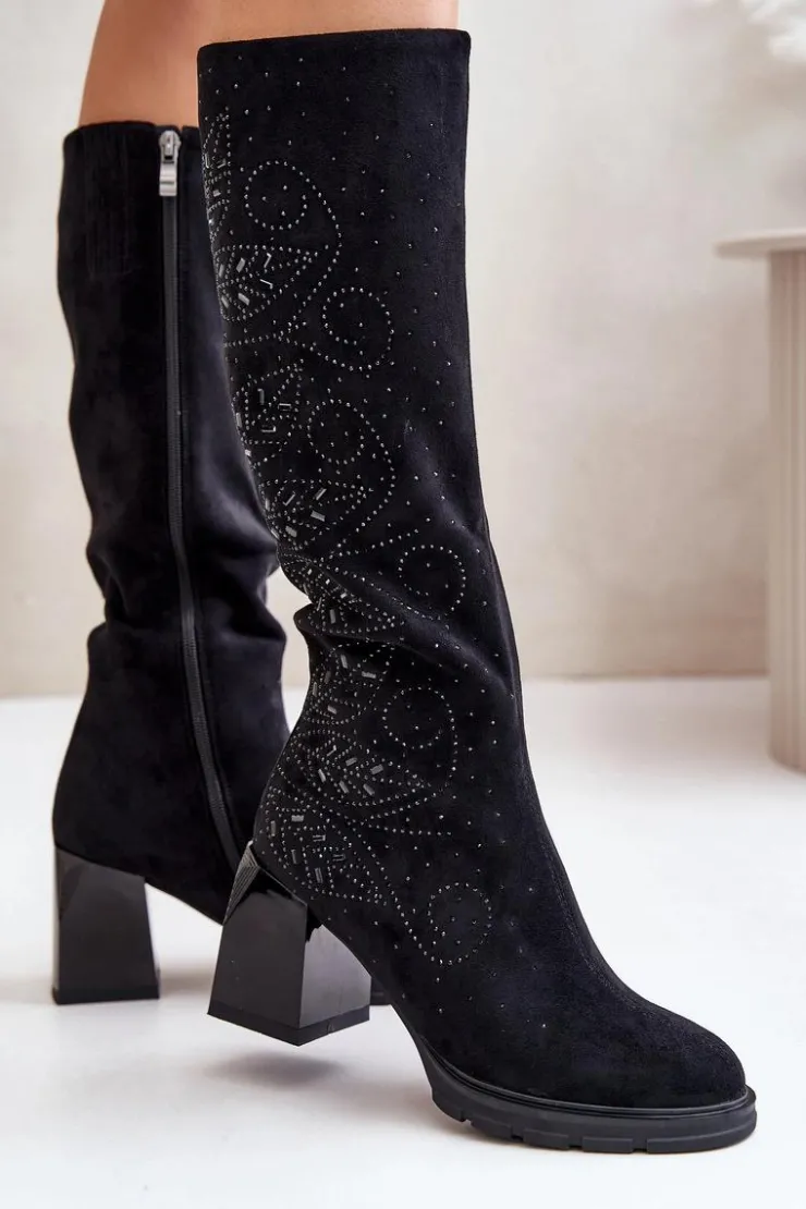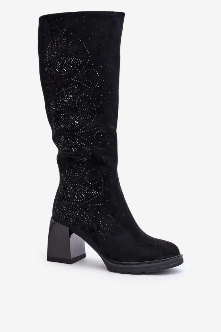 Damskie buty S.Barski Zdobione Kozaki Damskie Przed Kolano Ocieplane Na Słupku MR880-158 Czarne