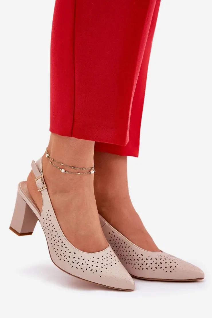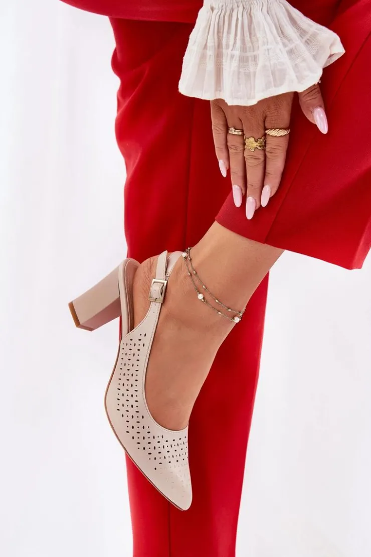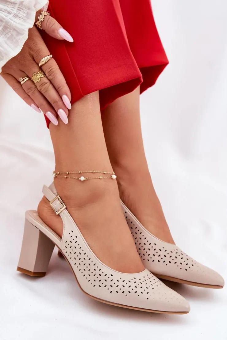 Sandały damskie wykonane z eko skóry, ozdobione ażurowym wzorem, to elegancki wybór na ciepłe dni. Szpiczaste noski subtelnie wysmuklają nogi, dodając im smukłości. Zapinane na sprzączkę z regulowanym paskiem, pozwalają na idealne dopasowanie do stopy. Obcas w formie słupka zapewnia stabilność, a całość łączy styl i wygodę, doskonale komponując się z letnimi sukienkami, spódnicami czy eleganckimi spodniami. Przy wyborze rozmiaru prosimy sugerować się tabelą rozmiarów.