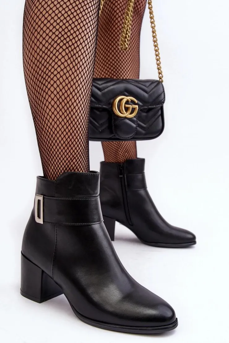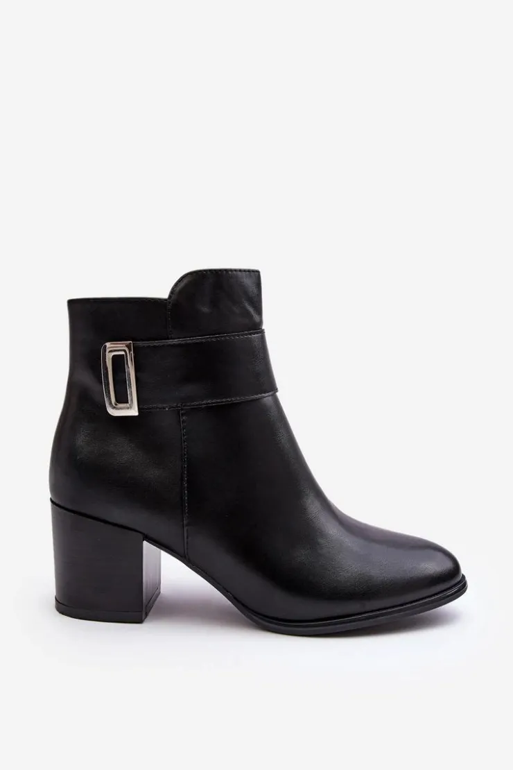 Damskie botki wykonane z eko skóry. Ocieplone kocem obuwniczym. Osadzone na obcasie w postaci niskiego słupka. Noski zaokrąglone. Usztywniony zapiętek. Cholewka ozdobiona paskiem. Model ten zapinany jest na suwak z boku. Środek ocieplony kocem obuwniczym. Zapiętek jest usztywniony. Koniecznie musisz je mieć! Przy wyborze rozmiaru prosimy sugerować się tabelą rozmiarów.