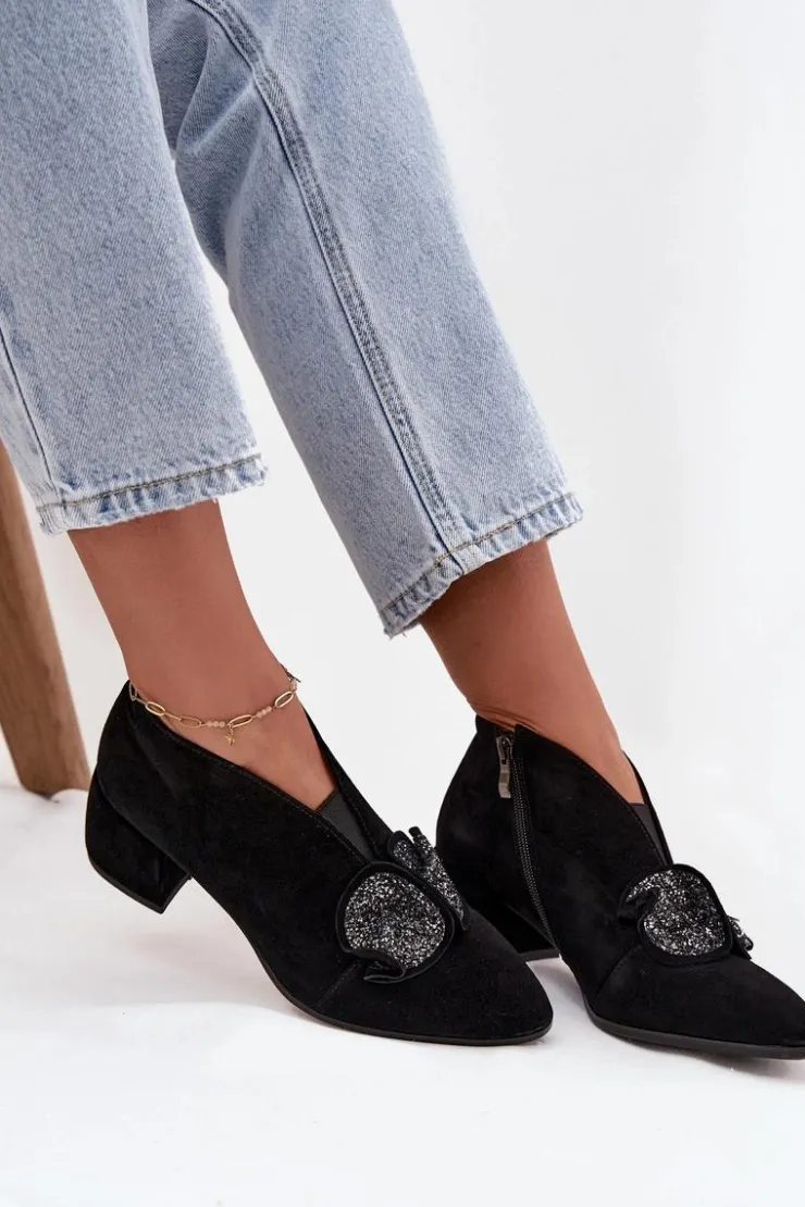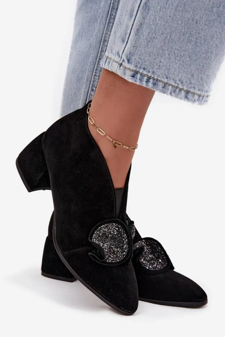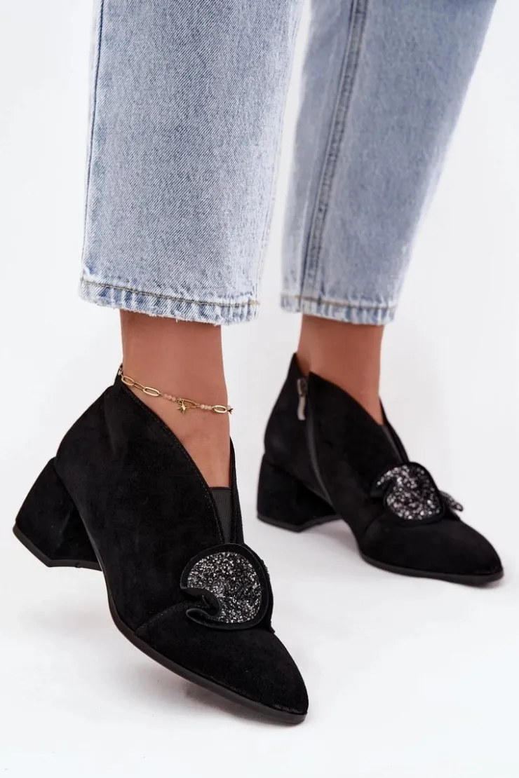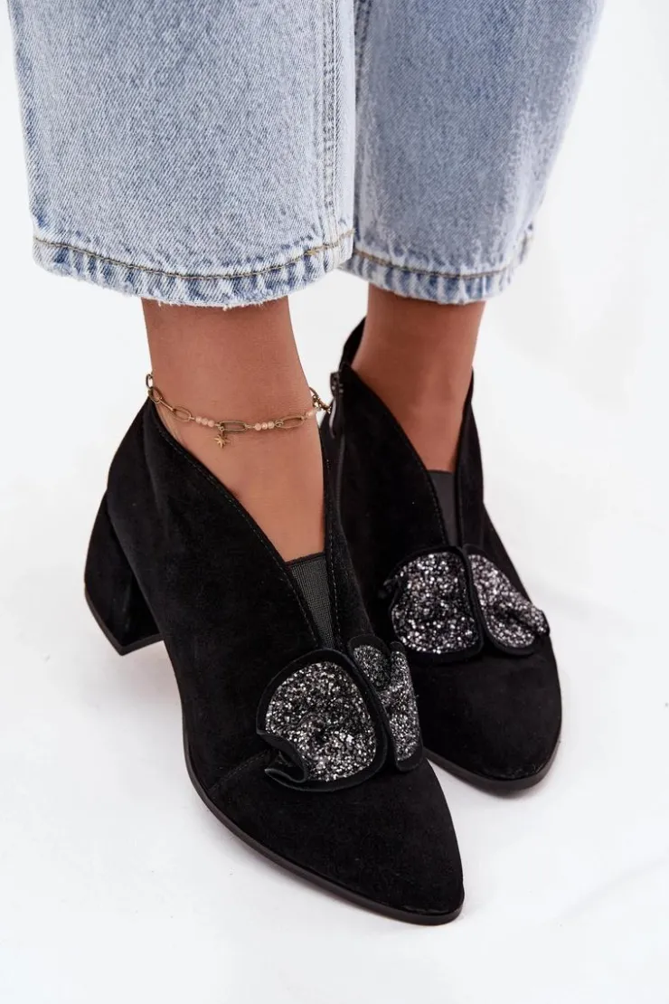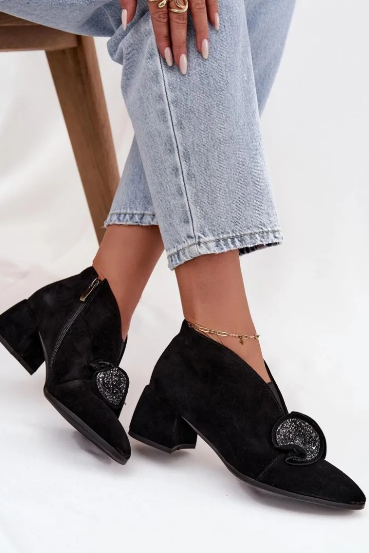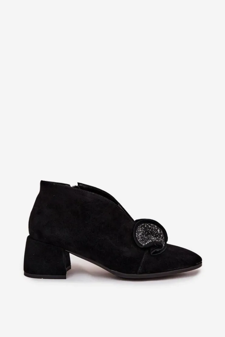 Eleganckie, niskie botki damskie z naturalnego zamszu to propozycja, która łączy klasyczny styl z wygodą użytkowania. Wykonane z wysokiej jakości materiału, prezentują się szykownie i ponadczasowo, a jednocześnie gwarantują trwałość na wiele sezonów. Osadzone na stabilnym obcasie w formie klocka, zapewniają komfort podczas noszenia i dodają sylwetce subtelnej elegancji. Migdałowe noski podkreślają kobiecy charakter obuwia, a efektowny detal umieszczony z przodu sprawia, że model wyróżnia się i przyciąga spojrzenia. Zapięcie na zamek ułatwia zakładanie i zdejmowanie, a skórzana wkładka zwiększa wygodę oraz dba o komfort stóp w ciągu dnia. Doskonałe do formalnych stylizacji, a jednocześnie idealne na wieczorne wyjścia i specjalne okazje. Elegancki krój i stylowe detale sprawiają, że świetnie uzupełnią klasyczne zestawy, dodając im szyku i kobiecego charakteru. Przy wyborze rozmiaru prosimy sugerować się tabelą rozmiarów.