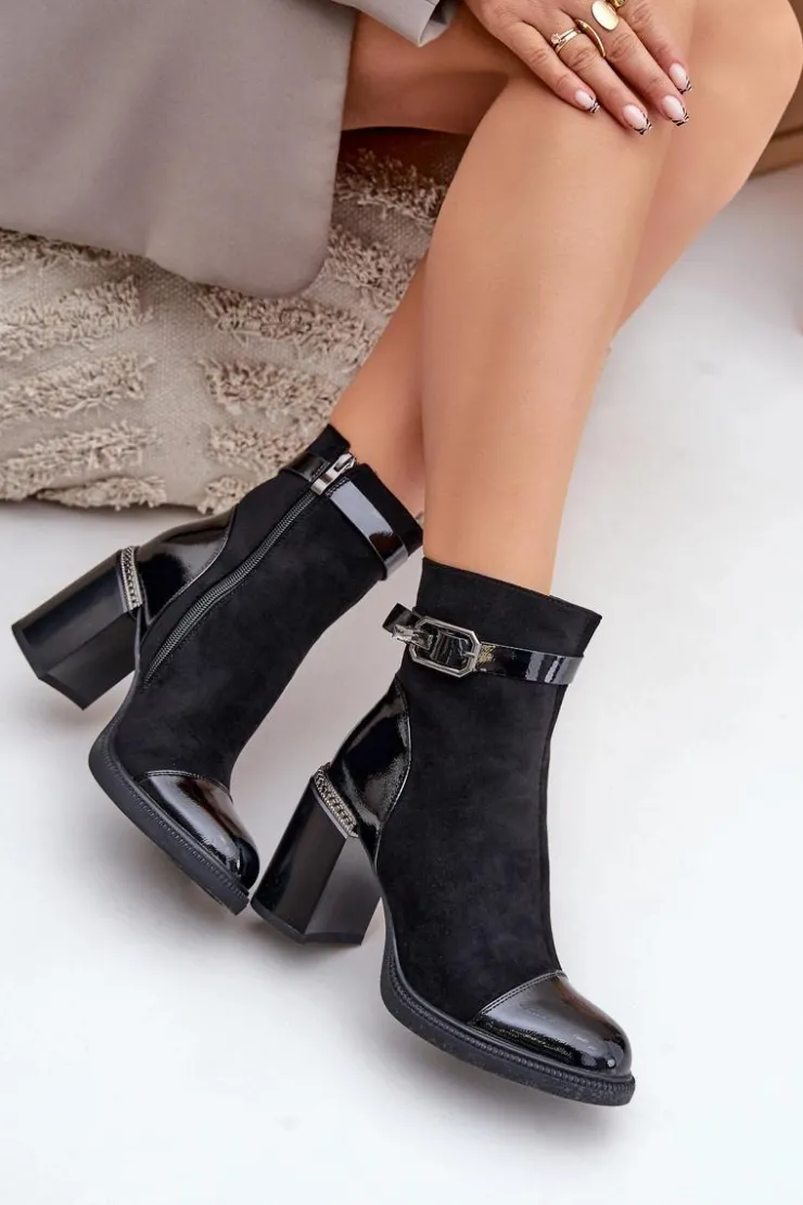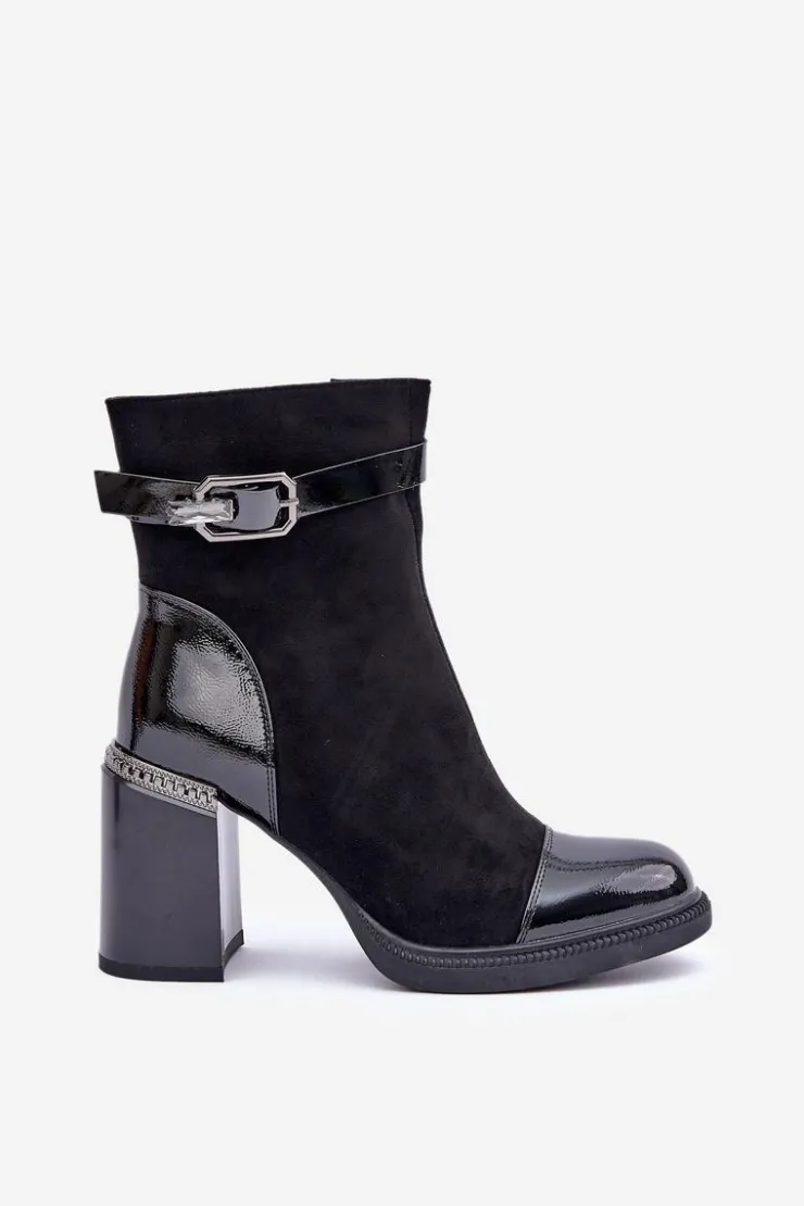 Eleganckie botki wykonane z eko skóry. Model ten wyróżnia ozdobny element przy obcasie oraz klamra, która nadaje elegancji. Wnętrze ocieplane dla dodatkowego komfortu w chłodniejsze dni. Model zapinany na zamek, z noskami w migdał. Idealne do wielu stylizacji! Przy wyborze rozmiaru prosimy sugerować się tabelą rozmiarów.