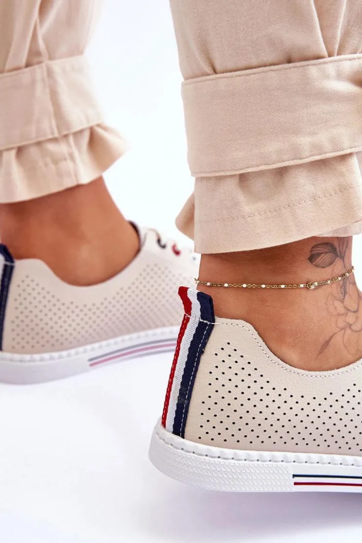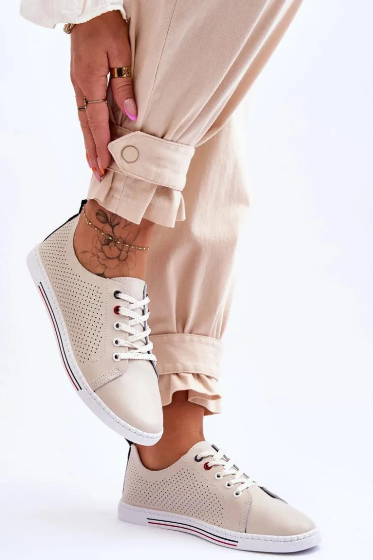 Niskie trampki damskie zostały wykonane z naturalnej skóry. Ażurowa cholewka świetnie sprawdzi się w cieplejsze dni, gdyż zapewnia odpowiednią wentylację obuwia. Model posiada sznurowadła z ozdobną nicią. Tenisówki osadzono na niskiej platformie z gumową, antypoślizgową podeszwą. Wkładka Comfort została wykonana także z naturalnej skóry. Przy wyborze rozmiaru prosimy sugerować się tabelą rozmiarów.