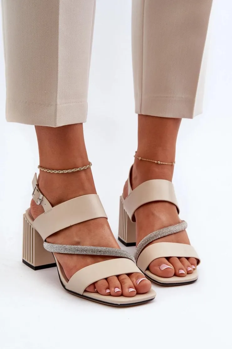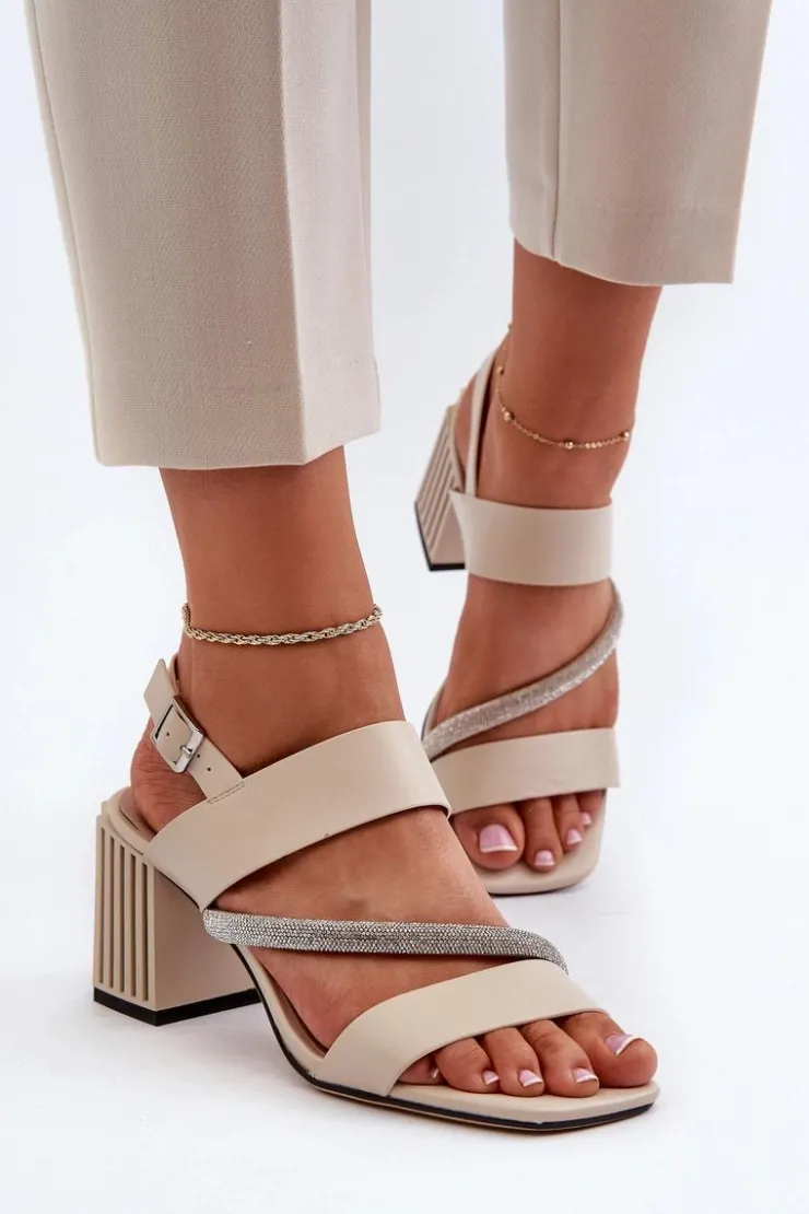 Eleganckie sandały damskie wykonane z eko skóry. Osadzone na obcasie w postaci słupka. Dodatkowy urok dodaje im ozdobny paseczek zdobiony licznymi małymi cyrkoniami, które przyciągają uwagę i nadają butom wyjątkowego blasku. To idealne obuwie na specjalne okazje i wieczorne wyjścia, które podkreśli Twój indywidualny styl. Przy wyborze rozmiaru prosimy sugerować się tabelą rozmiarów.