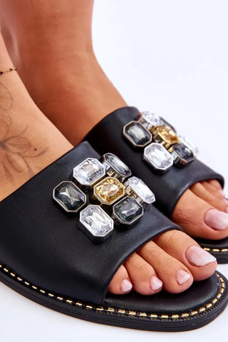 Damskie klapki zostały wykonane z wysokiej jakości eko skóry. Model ten został dodatkowo ozdobiony kamieniami. Wkładka w tych butach jest niezwykle wygodna i wykonana z eko skóry. Klapki osadzono na płaskim obcasie z podeszwą ozdobioną ćwiekami. Koniecznie sprawdź także pozostałe modele klapek na naszej stronie! Przy wyborze rozmiaru prosimy sugerować się tabelą rozmiarów.