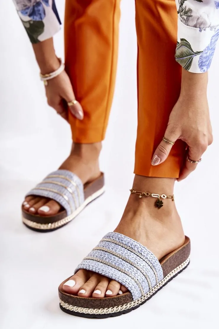 Damskie klapki wykonane z wierzchu z tworzywa sztucznego w postaci plecionych warkoczy. Posiadają ozdobne łańcuszki na przodzie oraz wokół podeszwy. Model klasyczny, wsuwany. Wkładka Comfort wykonana z eko skóry. Klapki są osadzone na platformie. Podeszwa wykonana z tworzywa sztucznego. Nosek odkryty, zaokrąglony. Idealny model na co dzień! Te buty świetnie sprawdzą się podczas spaceru, zakupów czy nawet do domu zamiast papci.Przy wyborze rozmiaru prosimy sugerować się tabelą rozmiarów.