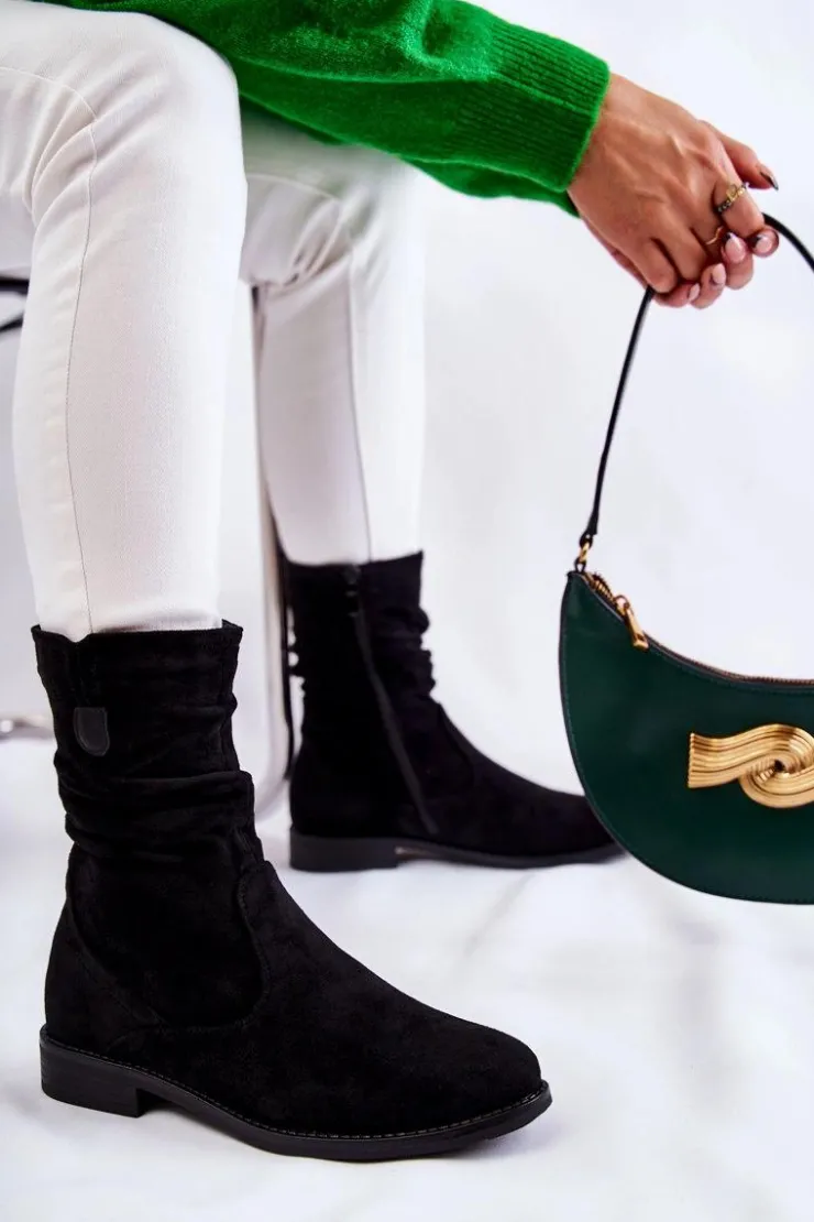 Wyjątkowe botki damskie z wysoką cholewką wykonaną z eko zamszu z marszczeniem. Osadzone na płaskim obcasie z antypoślizgową podeszwą. Zapiętek jest usztywniany. Botki wewnątrz zostały ocieplone miłym w dotyku kocem obuwniczym. Z boku posiadają suwak ułatwiający zakładanie obuwia. Koniecznie sprawdź także pozostałe botki dostępne w naszej ofercie! Przy wyborze rozmiaru prosimy sugerować się tabelą rozmiarów.