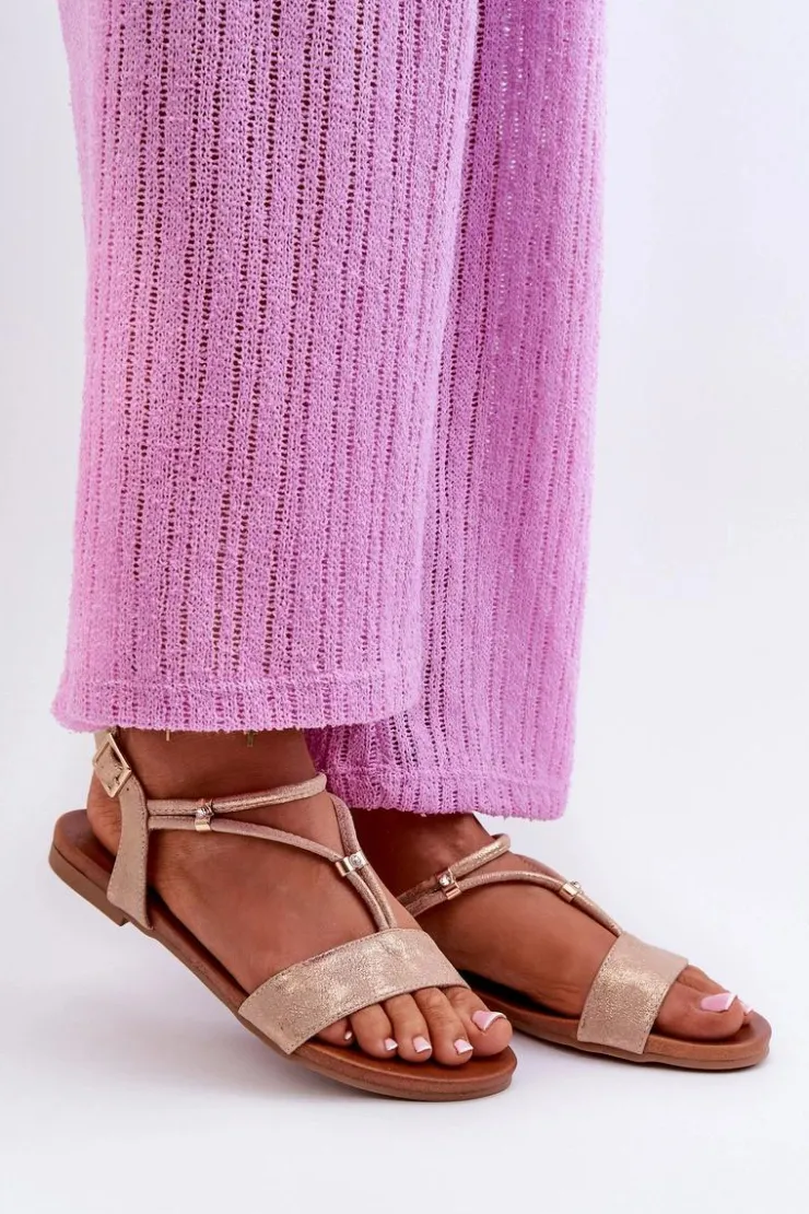 Płaskie sandały damskie wykonane z wysokiej jakości eko skóry. Zapięcie na regulowany pasek ze sprzączką zapewnia idealne dopasowanie i wygodę noszenia. Idealne na ciepłe dni, łączą styl z funkcjonalnością, doskonale sprawdzając się zarówno na codzienne spacery, jak i na bardziej eleganckie okazje. Przy wyborze rozmiaru prosimy kierować się tabelą rozmiarów.