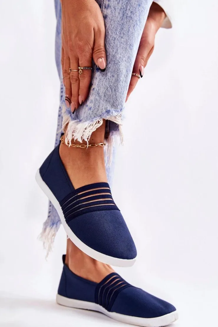 Tenisówki slip-on z cholewką przed kostkę zostały wykonane z materiału tekstylnego. Osadzone na delikatnej platformie z zaokrąglonym noskiem. Model wsuwany. Idealne na co dzień — do pracy, na zakupy czy spotkanie ze znajomymi. Wygodne i komfortowe w użytkowaniu. Posiadają materiałową wkładkę oraz ozdobne, prześwitujące paseczki. UWAGA! Podeszwy są delikatnie przybrudzone. Przy wyborze rozmiaru prosimy sugerować się tabelą rozmiarów.