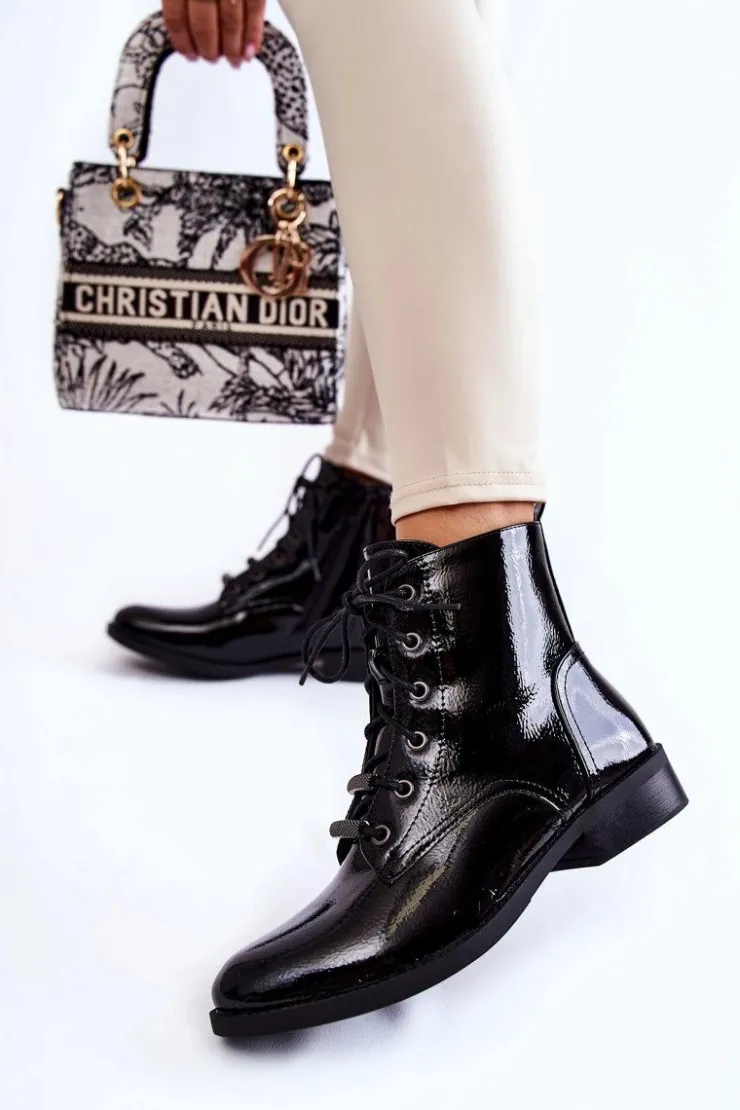 Klasyczne i eleganckie botki ze skóry ekologicznej. Wnętrze pokryte jest ciepłym i miłym w dotyku futerkiem, które gwarantuje komfort w każdej sytuacji. Botki osadzono na płaski m obcasie. Klasyczne sznurowanie na przodzie zostało przyozdobione blaszkami. Dodatkowo botki posiadają suwak z boku cholewki oraz usztywniany zapiętek. Koniecznie sprawdź całą naszą ofertę botków! Przy wyborze rozmiaru prosimy sugerować się tabelą rozmiarów.