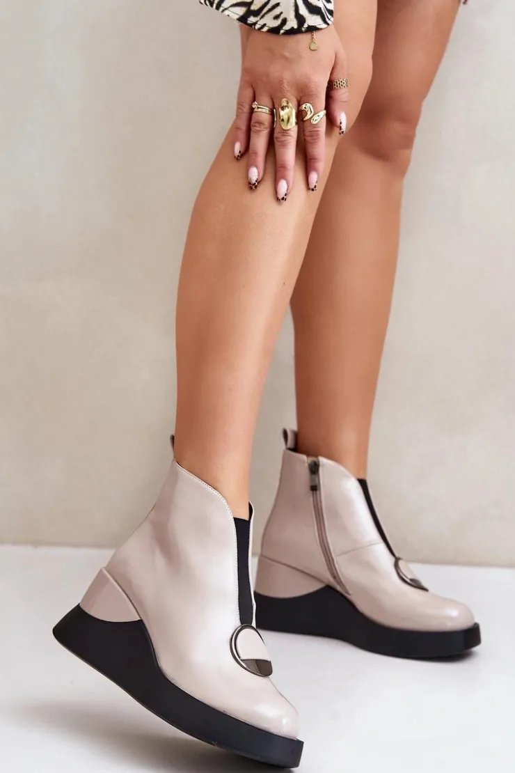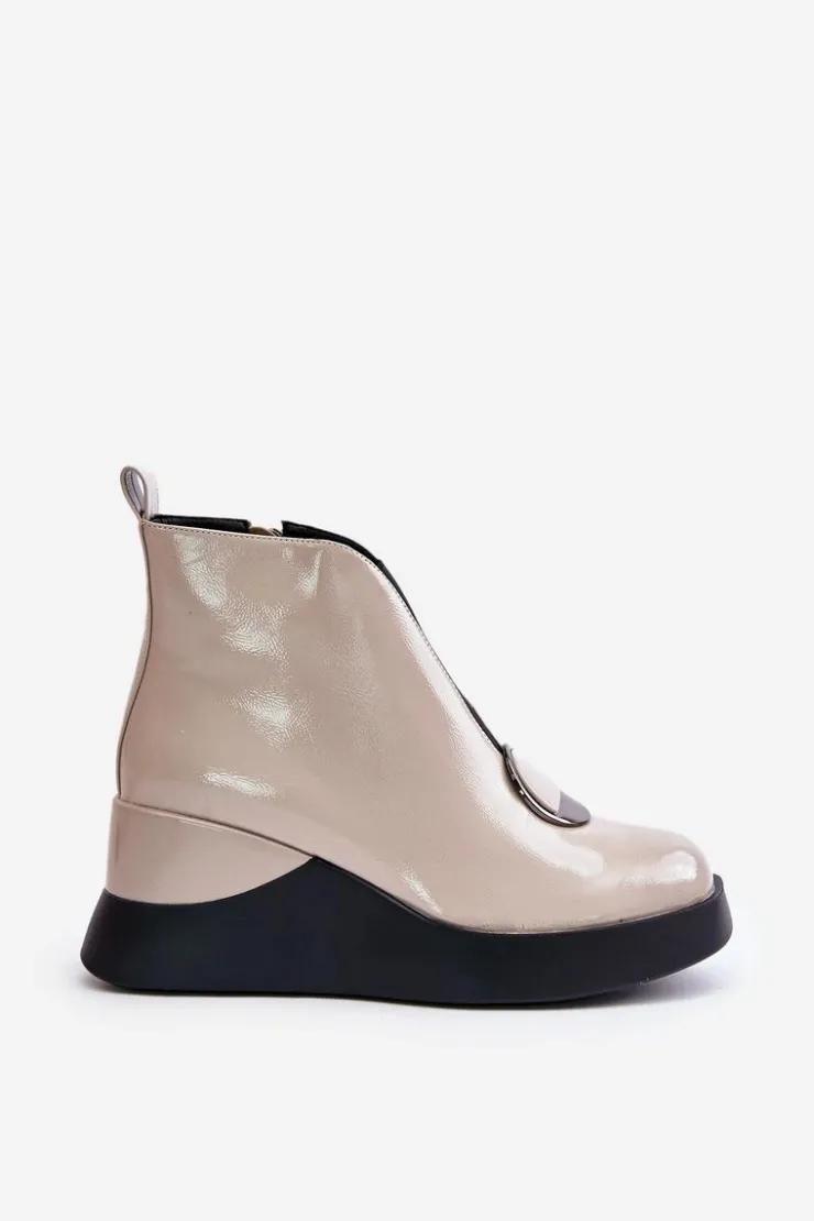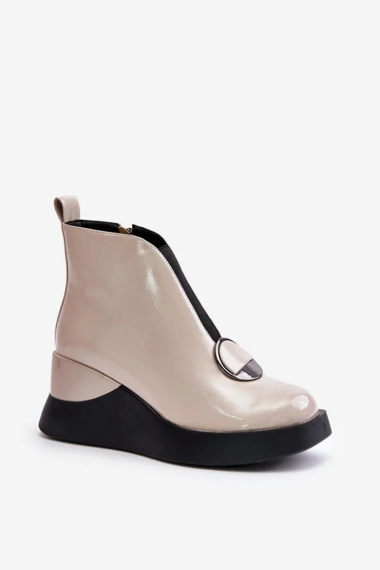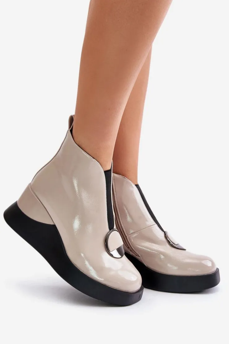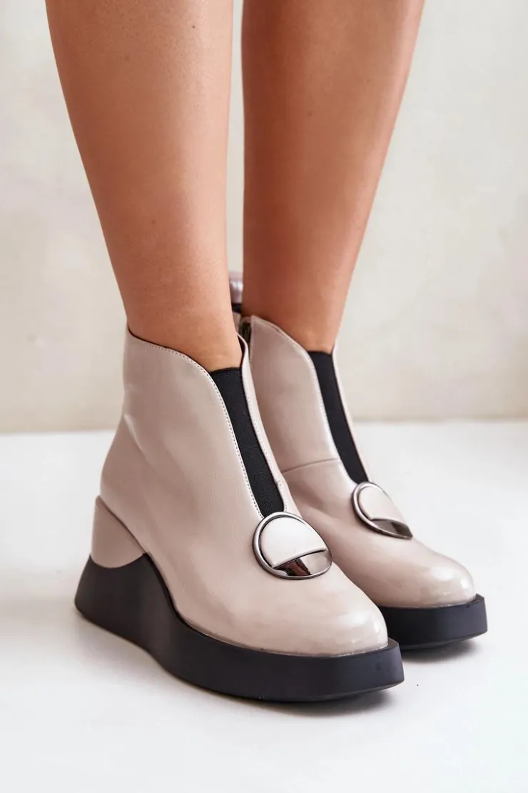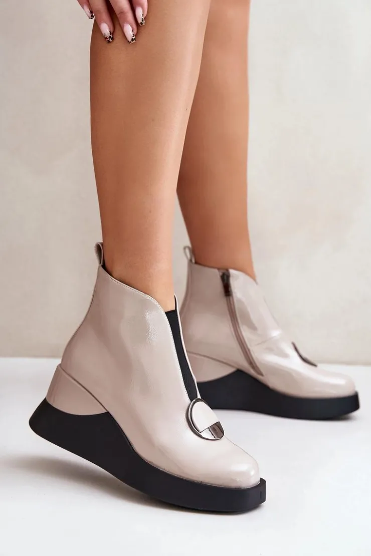 Eleganckie botki damskie osadzone na koturnie i platformie. Wykonane z eko skóry. Zapinane na suwak z boku. Z Przodu elastyczna wstawka oraz ozdoba. Noski zaokrąglone. Środek ocieplony kocem obuwniczym. Model ten z pewnością dopełni wiele jesienno-zimowych stylizacji! Przy wyborze rozmiaru prosimy sugerować się tabelą rozmiarów.