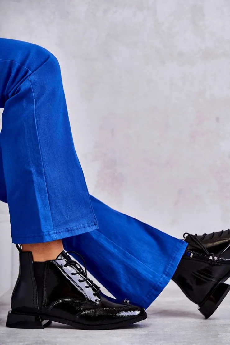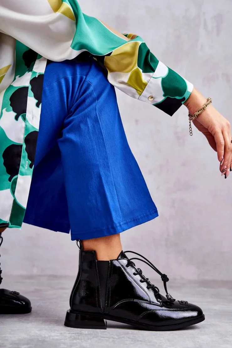 Te botki świetnie sprawdzą się podczas jesiennego sezonu! Wykonane z wysokiej jakości eko skóry z elastyczną wstawką z boku cholewki, dzięki której obuwie będzie lepiej dopasowane. Zapinane na suwak. Z przodu posiadają ściągacz, a przy nosku ozdobny element. Osadzone na płaskim obcasie. Dodatkowo zapiętek jest usztywniany. Środek został ocieplony miłym, w dotyku kocem obuwniczym. Przy wyborze rozmiaru prosimy sugerować się tabelą rozmiarów.