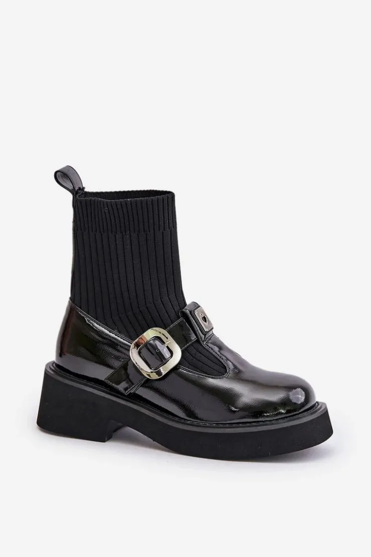 Lakierowane botki damskie osadzone na niskim, szerokim obcasie i platformie. Cholewka w formie skarpety, dodatkowo zdobiona stylowym paskiem z klamrą, nadaje im nowoczesny charakter. Środek ocieplony kocem obuwniczym wyłącznie na wysokości stopy. Idealne do miejskich stylizacji, łączą wygodę z modnym wyglądem. Przy wyborze rozmiaru prosimy sugerować się tabelą rozmiarów.
