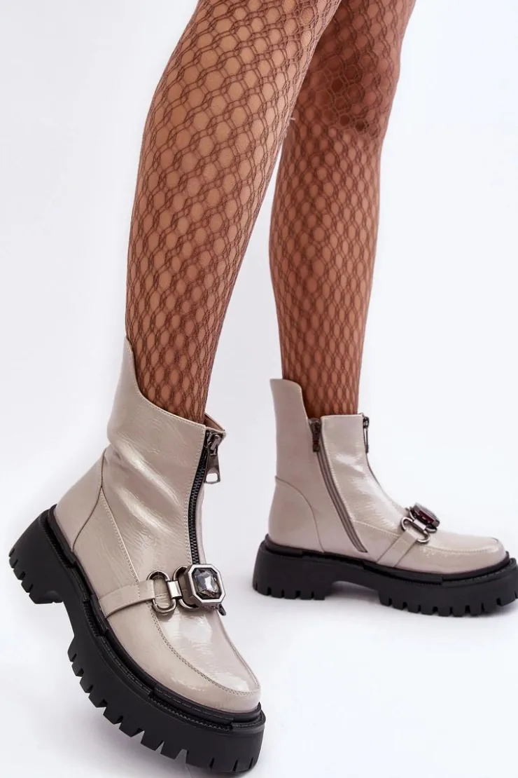 Piękne, damskie botki zostały wykonane z wysokiej jakości eko skóry. Osadzono je na płaskim obcasie. Przód obuwia został wzbogacony modnym kryształem. Wnętrze obuwia ocieplono miękkim kocem obuwniczym. Model ten jest zapinany na suwak z boku oraz dodatkowo posiada na przodzie imitację zamka. Zapiętek w tych butach został usztywniony. Przy wyborze rozmiaru prosimy sugerować się tabelą rozmiarów.