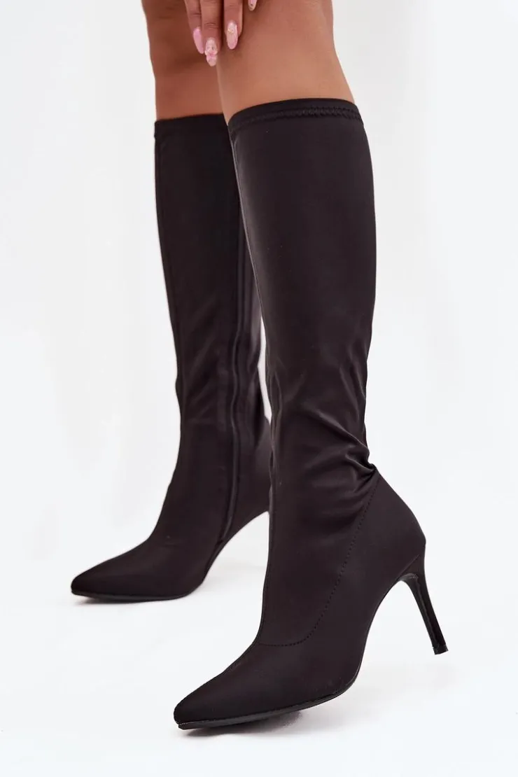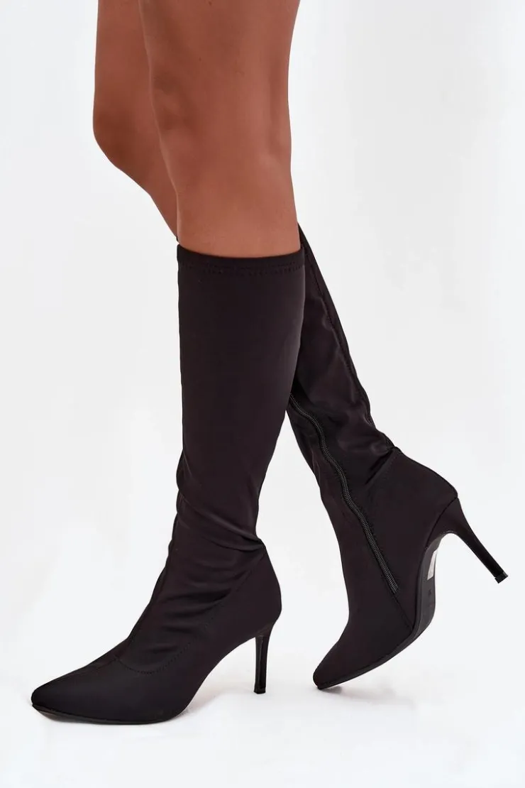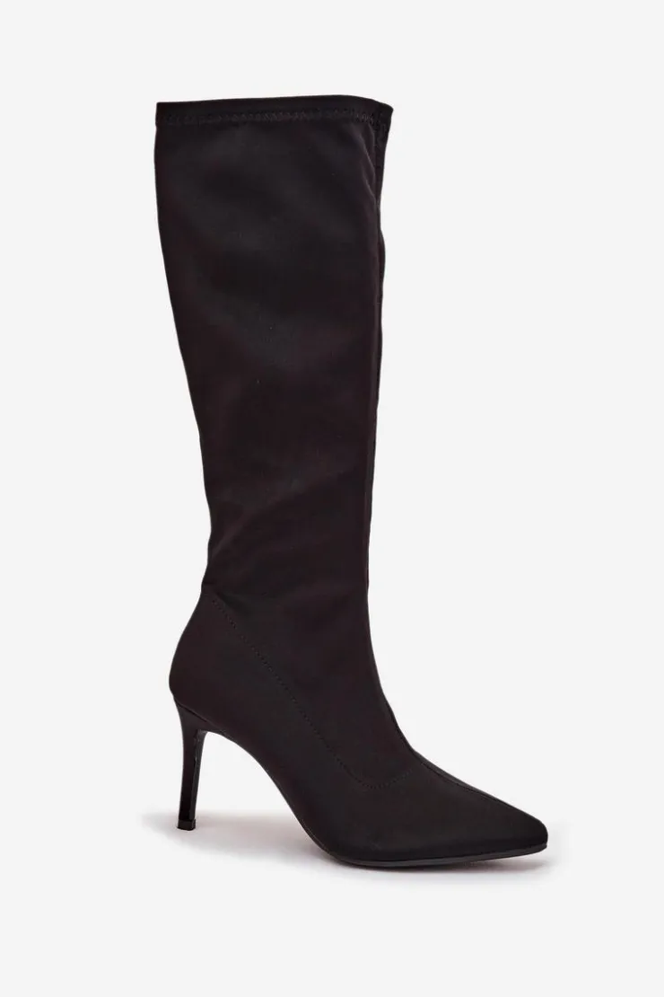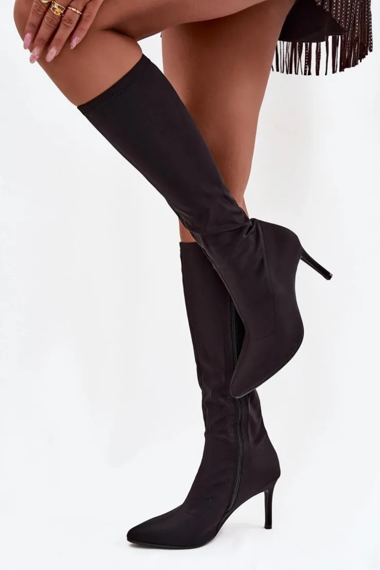 Kozaki damskie od marki S.Barski wykonane z wysokiej jakości materiału tekstylnego. Model osadzono na obcasie typu szpilka, który optycznie wydłuża nogi i podkreśla sylwetkę. Szpiczaste noski dodają subtelnej elegancji i wysmuklają stopę, a dekoracyjne przeszycia na cholewce wprowadzają modny detal, który podkreśla charakter butów. Praktyczne zapięcie na zamek ułatwia szybkie zakładanie i zdejmowanie, czyniąc kozaki funkcjonalnym elementem garderoby. To model idealny do stylizacji eleganckich i wieczorowych, który świetnie komponuje się zarówno z sukienkami, spódnicami, jak i dopasowanymi spodniami. Przy wyborze rozmiaru prosimy kierować tabelą rozmiarów.