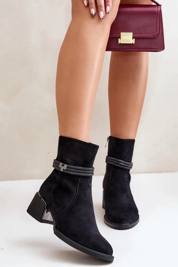 Botki damskie wykonane z wysokiej jakości eko zamszu. Osadzone na niskim obcasie. Noski w migdał. Środek ocieplany kocem obuwniczym. Zapinane na zamek. Głównym atutem tego modelu są błyszczące paseczki na cholewce. Przy wyborze rozmiaru prosimy sugerować się tabelą rozmiarów.