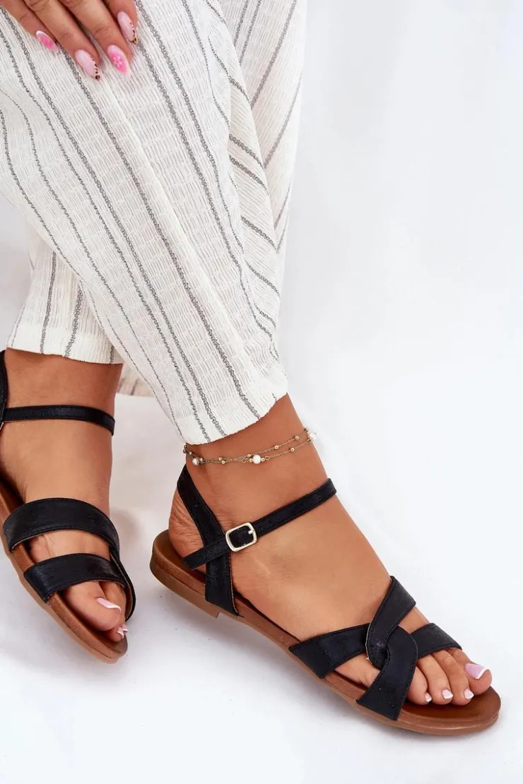 Damskie sandały wykonane z wysokiej jakości eko skóry to klasyczna propozycja na ciepłe dni. Model zapinany na sprzączkę z regulowanym paskiem umożliwia idealne dopasowanie do stopy, zapewniając wygodę przez cały dzień. Płaska podeszwa gwarantuje komfort i stabilność, a klasyczny fason sprawia, że te sandały doskonale komponują się z różnorodnymi letnimi stylizacjami. Przy wyborze rozmiaru prosimy kierować się tabelą rozmiarów.