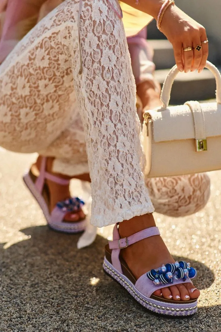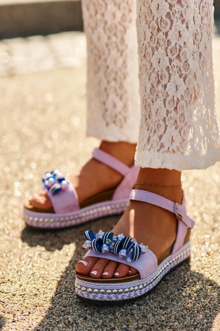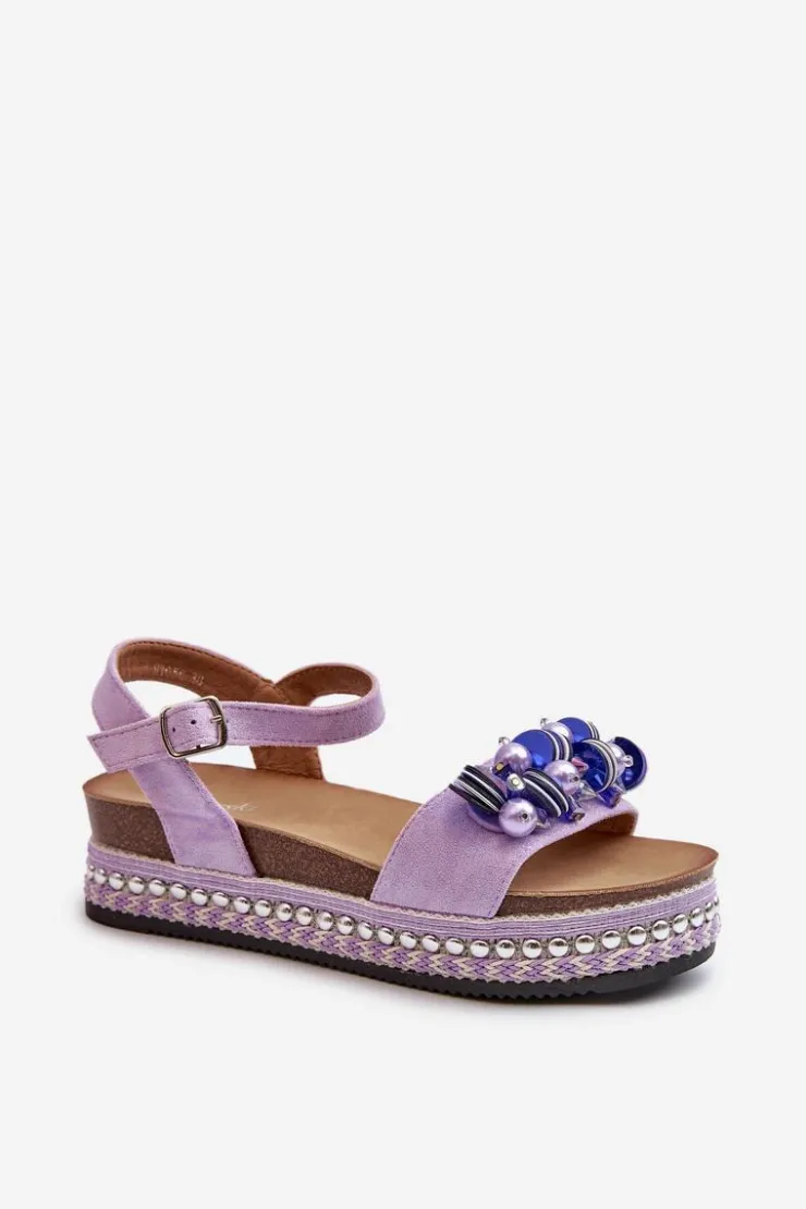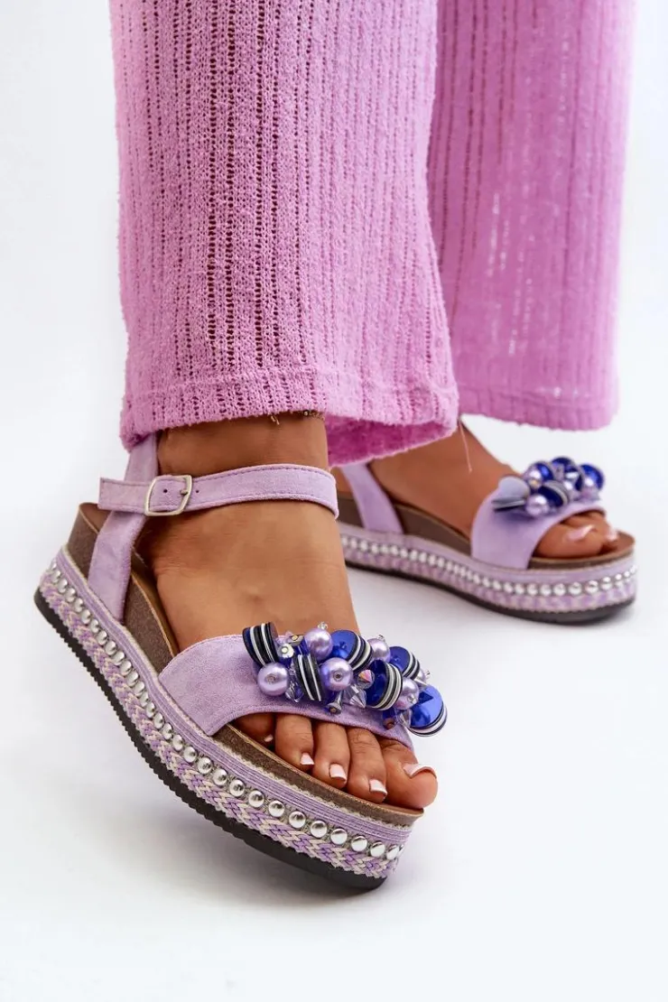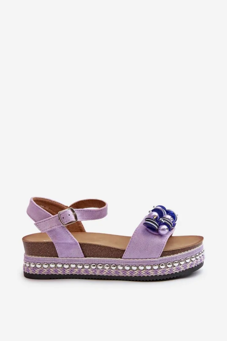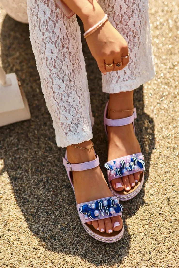 Sandały damskie wykonane z eko zamszu. Osadzone na zdobionej platformie i delikatnym koturnie. Regulowany pasek ze sprzączką gwarantuje idealne dopasowanie do stopy. Dodatkowo pasek z przodu ozdobiony detalami dodaje im niepowtarzalnego uroku i charakteru. Te sandały są doskonałym wyborem dla kobiet ceniących sobie modny wygląd i wygodę, idealne zarówno na codzienne spacery, jak i na letnie wyjścia. Przy wyborze rozmiaru prosimy kierować się tabelą rozmiarów.