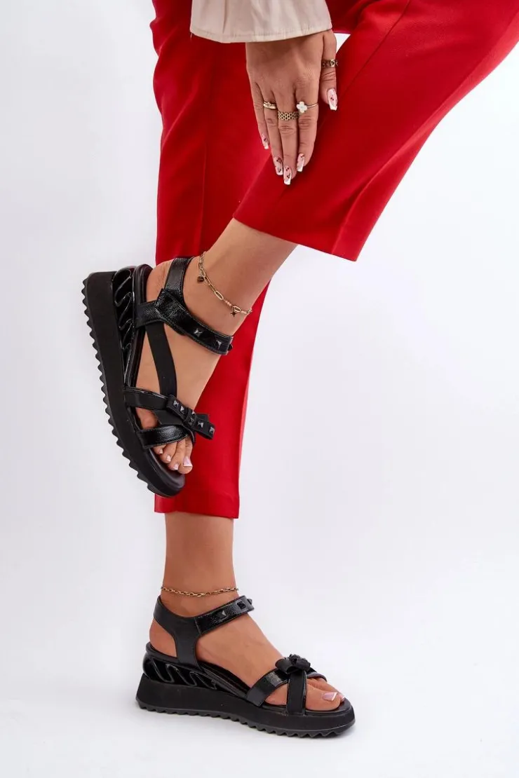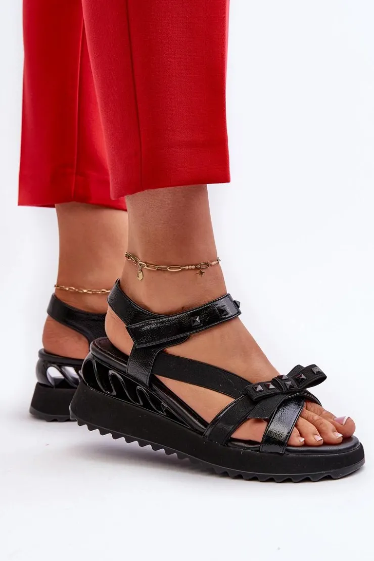 Niezwykle stylowe sandały damskie osadzone na platformie z koturnem. Praktyczne zapinanie na rzep zapewnia szybkie i wygodne dopasowanie do stopy. Kokardka z przodu nadaje im uroku i delikatności. Model ten pewnością przyciągnie spojrzenia! Przy wyborze rozmiaru prosimy sugerować się tabelą rozmiarów.