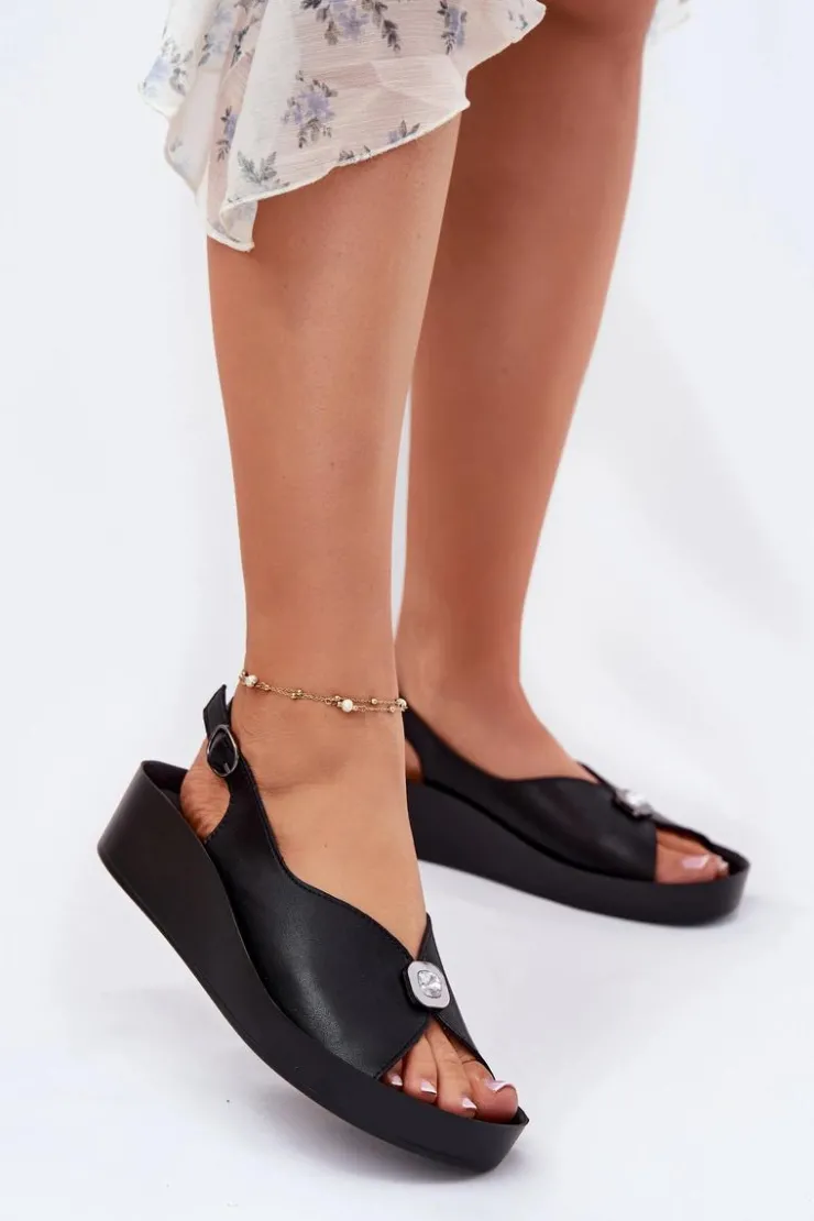 Eleganckie sandały damskie marki S.Barski. Osadzone na platformie i koturnie. Z przodu znajduje się subtelna ozdoba, która dodaje elegancji. Zapinane na regulowany pasek ze sprzączką, zapewniają doskonałe dopasowanie i komfort noszenia przez cały dzień. Stylowe i wygodne obuwie na każdą okazję. Przy wyborze rozmiaru prosimy kierować się tabelą rozmiarów.
