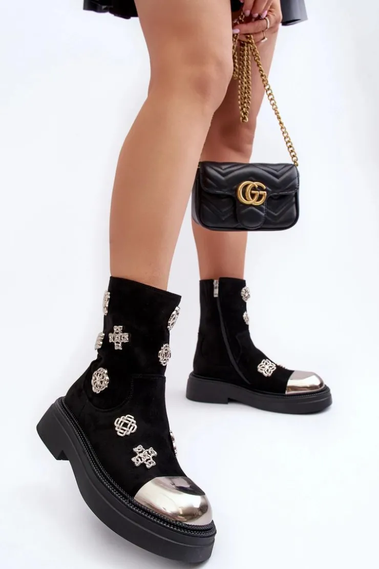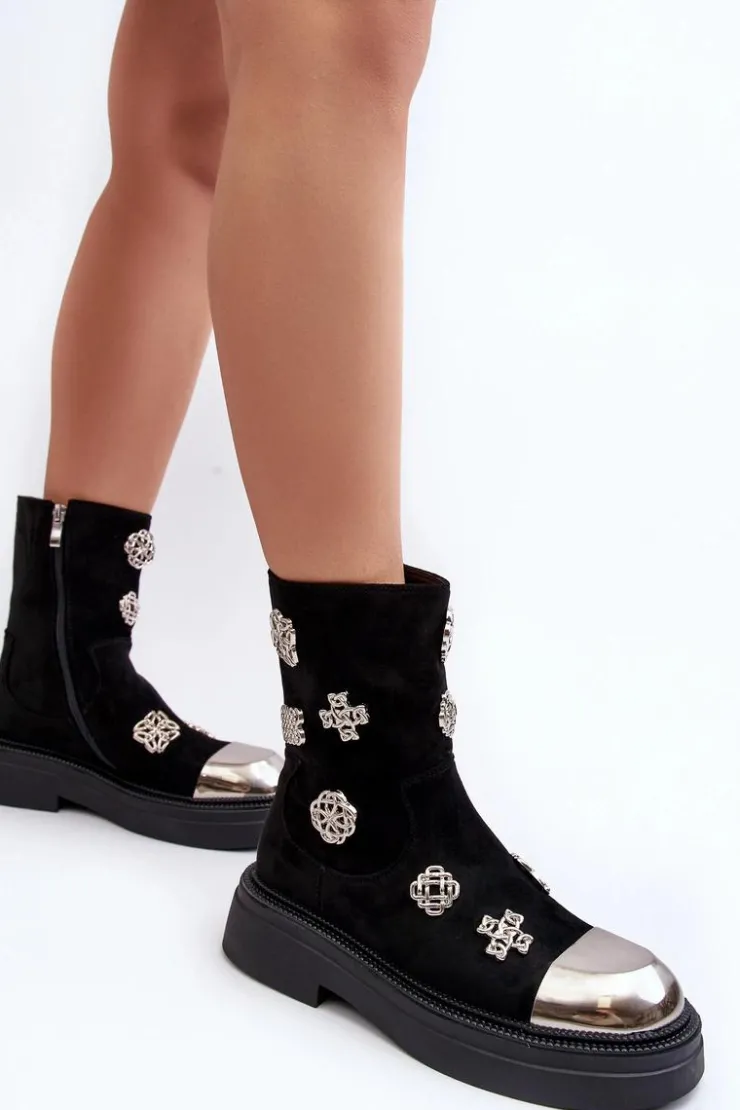 Botki damskie z ozdobami na cholewce. Wykonane z eko zamszu. Zapinane na suwak. Osadzone na płaskim obcasie i platformie. Środek ocieplony kocem obuwniczym. Dodatkowo zapiętek jest usztywniony. Ten modny model koniecznie powinien znaleźć się w Twojej szafie. Koniecznie sprawdź całą naszą ofertę botków! Przy wyborze rozmiaru prosimy sugerować się tabelą rozmiarów.