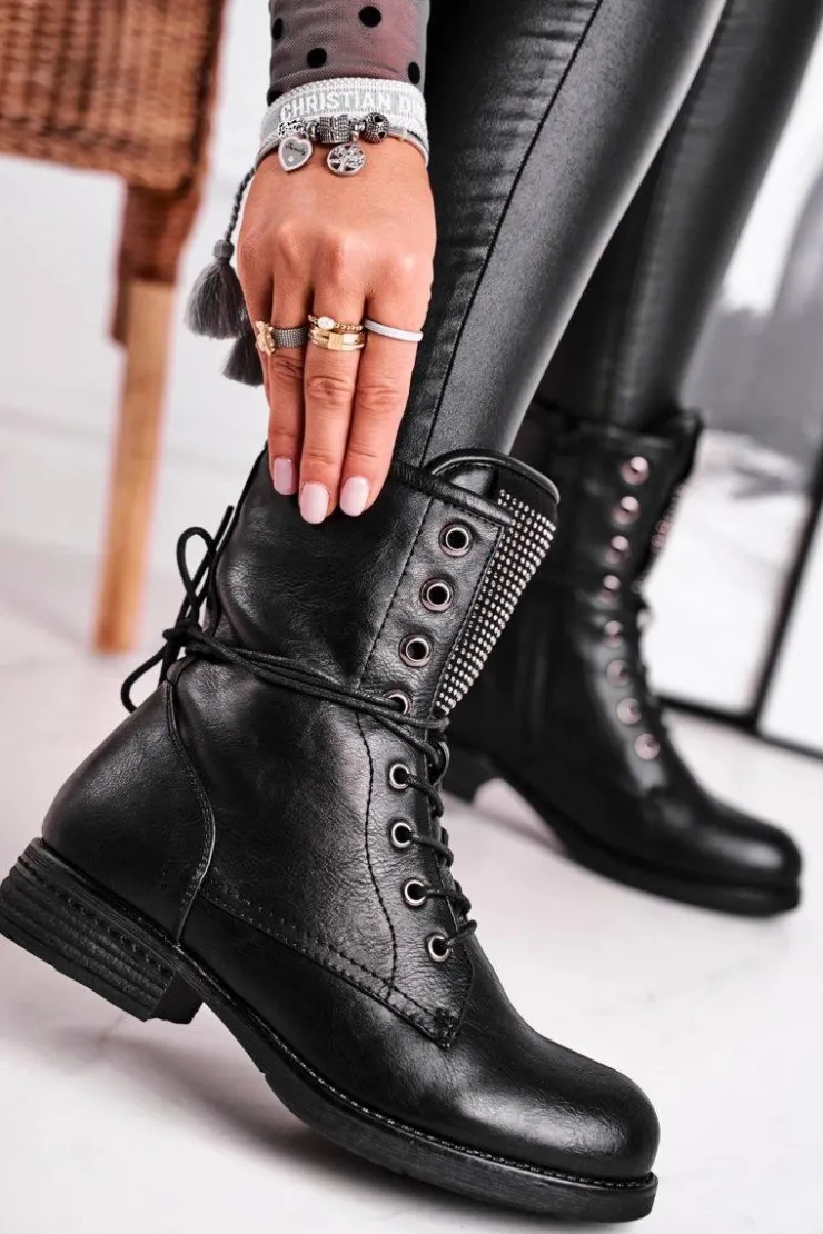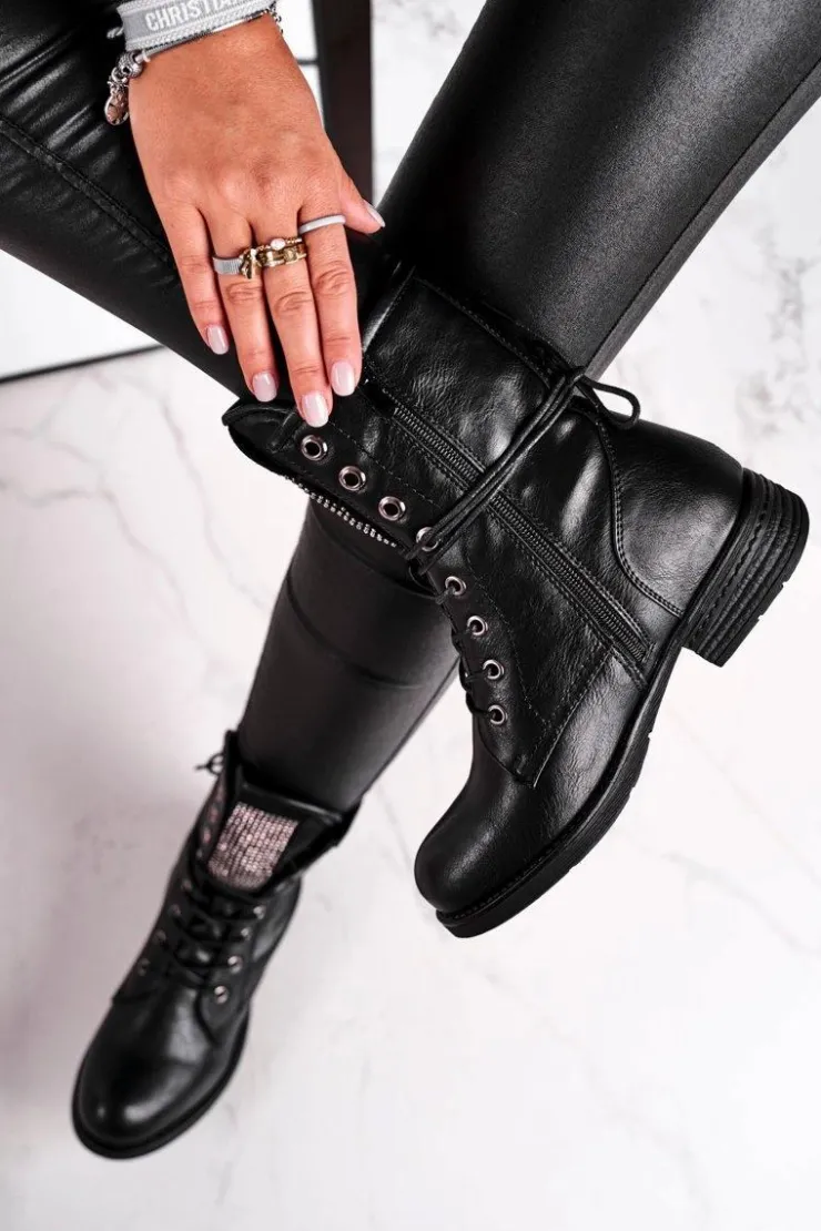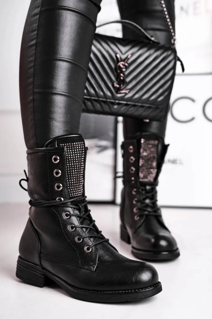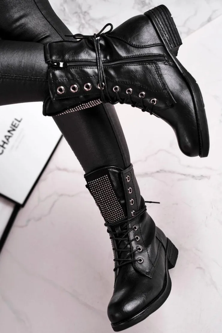Damskie Evento Botki Damskie Ciepłe Workery Z Cyrkoniami Czarne Seven Days