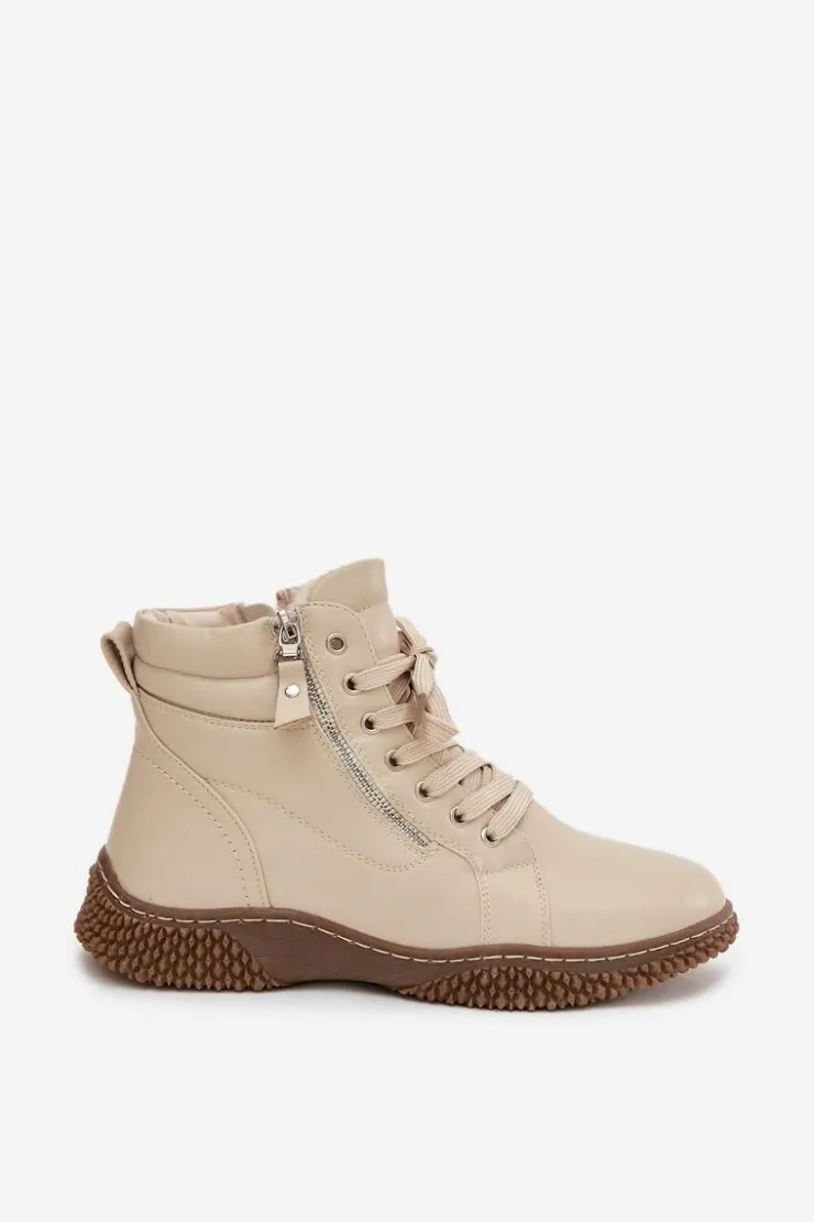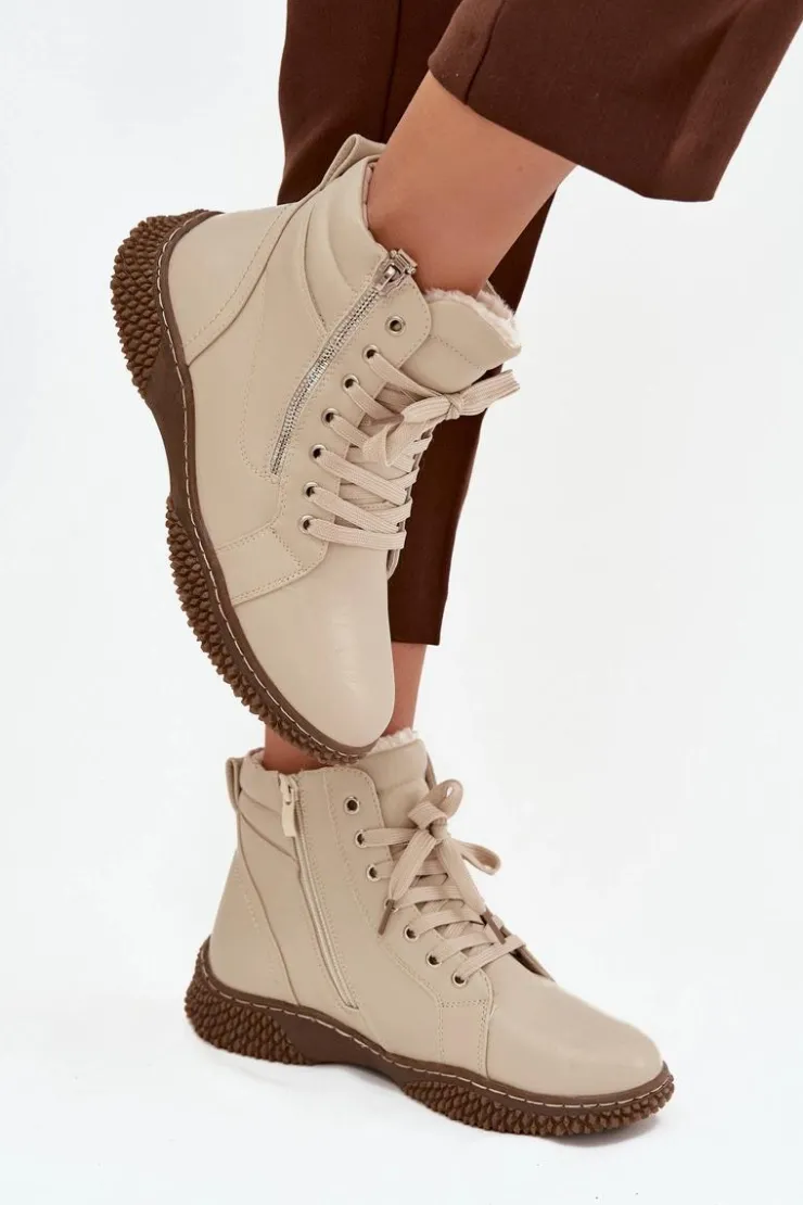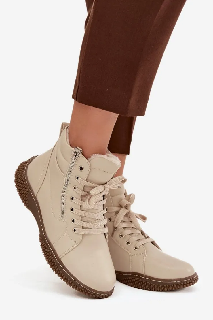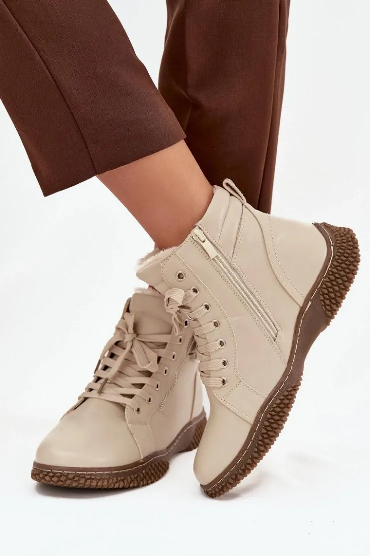 Botki damskie z eko skóry to stylowe i wygodne obuwie na chłodniejsze dni. Wnętrze ocieplone miękkim futerkiem zapewnia ciepło i komfort noszenia. Model łączy sznurowanie z podwójnym zamkiem, z czego jeden pełni funkcję ozdobną, dodając modnego charakteru. Doskonałe na codzienne wyjścia. Przy wyborze rozmiaru prosimy sugerować się tabelą rozmiarów.
