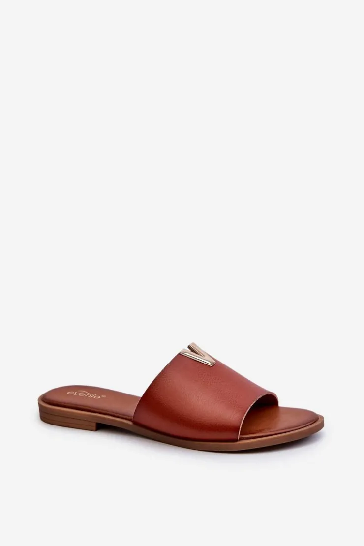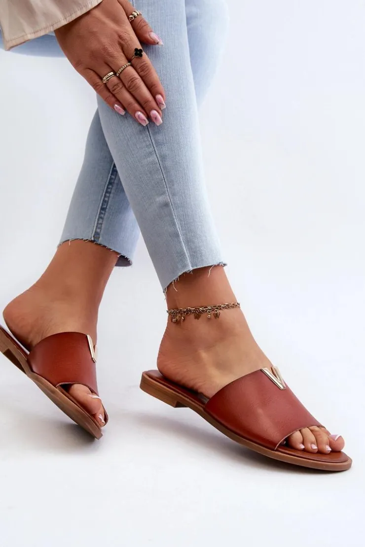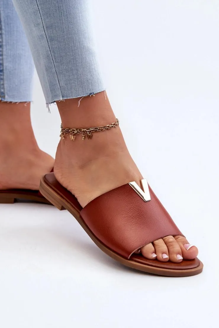 Klapki damskie wykonane ze skóry ekologicznej. Złoty element doda blasku Twojej letniej stylizacji. Osadzone na płaskim obcasie. Model ten będzie idealnym wyborem na wiele okazji! Przy wyborze rozmiaru prosimy sugerować się tabelą rozmiarów.