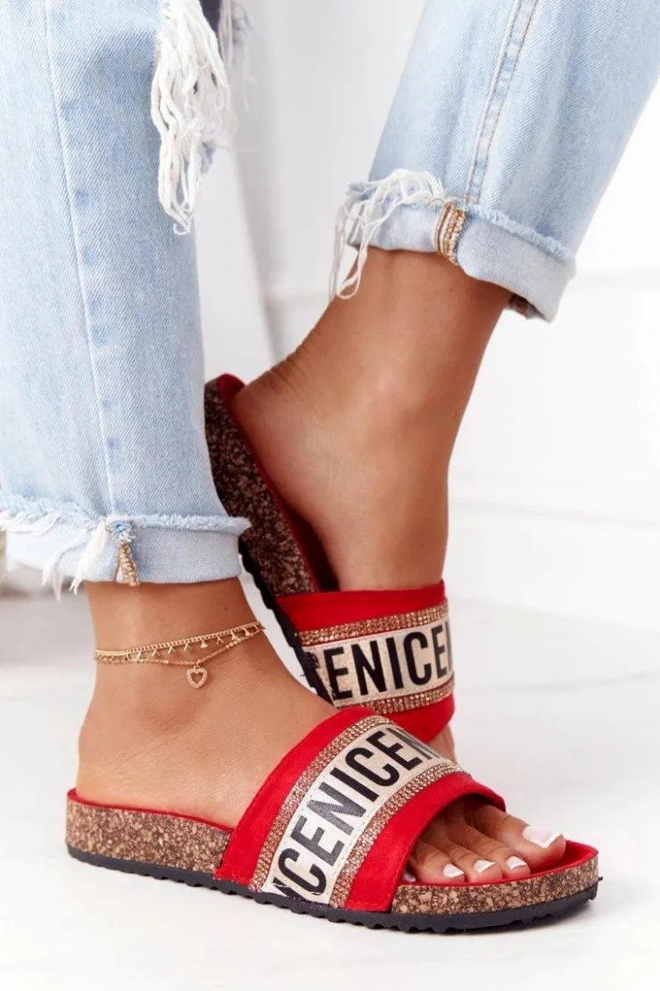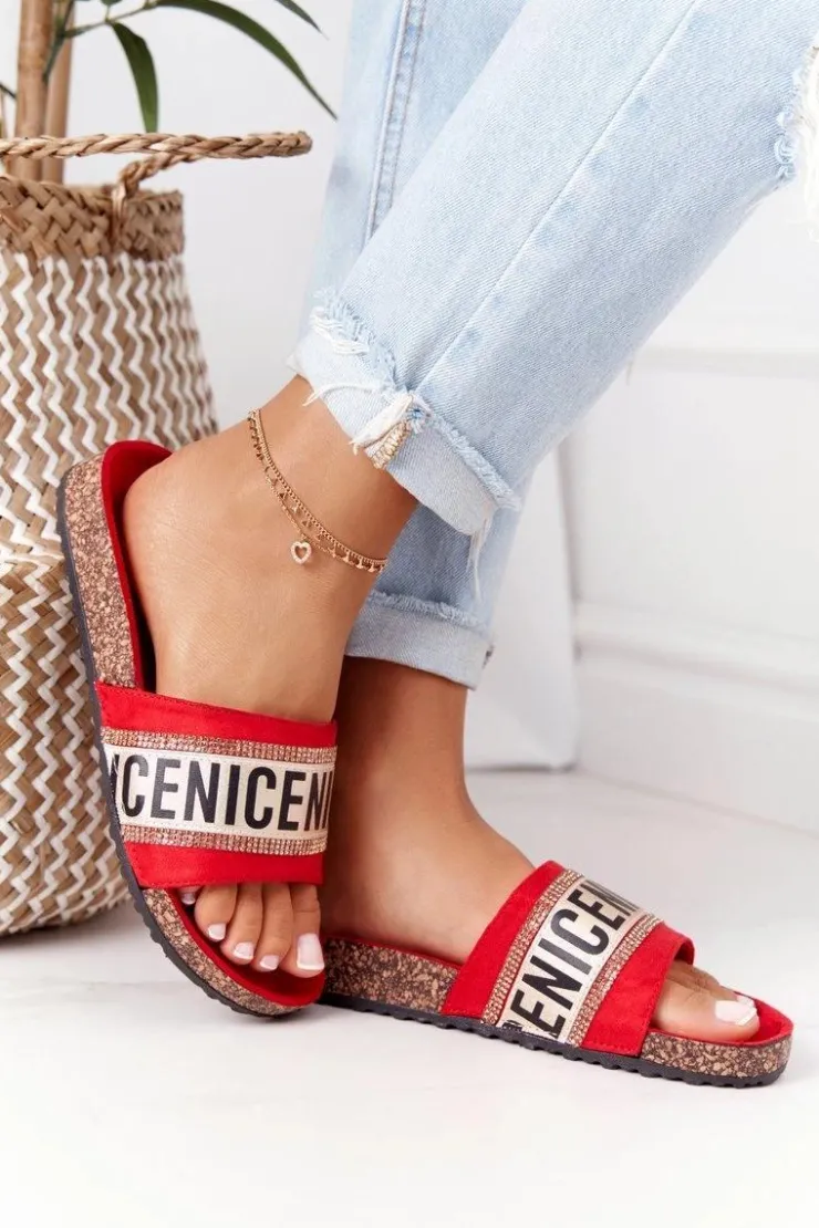 Komfortowe klapki damskie na korkowej podeszwie. Buty wykonane są z eko zamszu, posiadają delikatnie profilowaną wkładkę. Mody fason z cyrkoniami urozmaici Twoją garderobę!