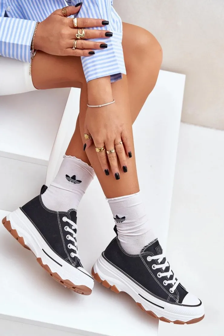 Trampki damskie wykonane z materiału tekstylnego. Osadzone na masywnej platformie, która unosi sylwetkę, a także nadaje każdej stylizacji niepowtarzalny charakter. Ten model jest niezbędny dla każdej kobiety pragnącej połączyć wygodę z modnym wizerunkiem. Przy wyborze rozmiaru prosimy sugerować się tabelą rozmiarów.