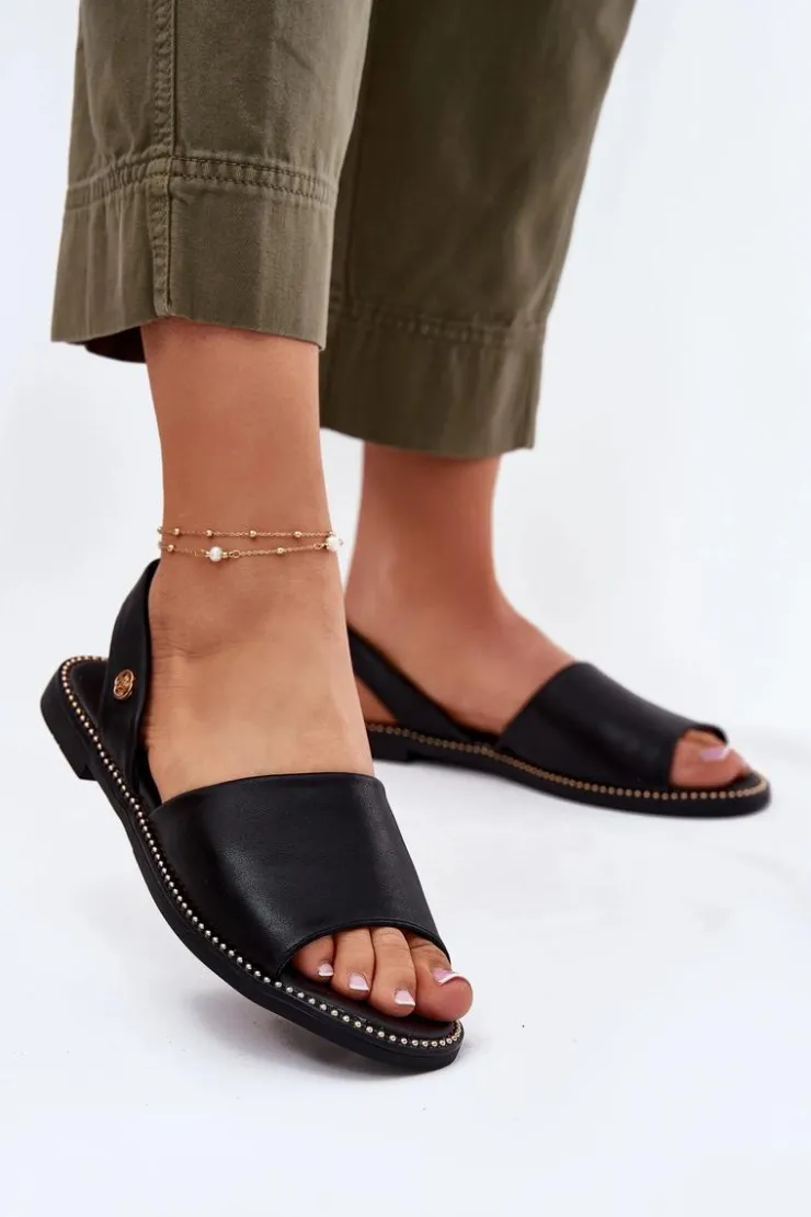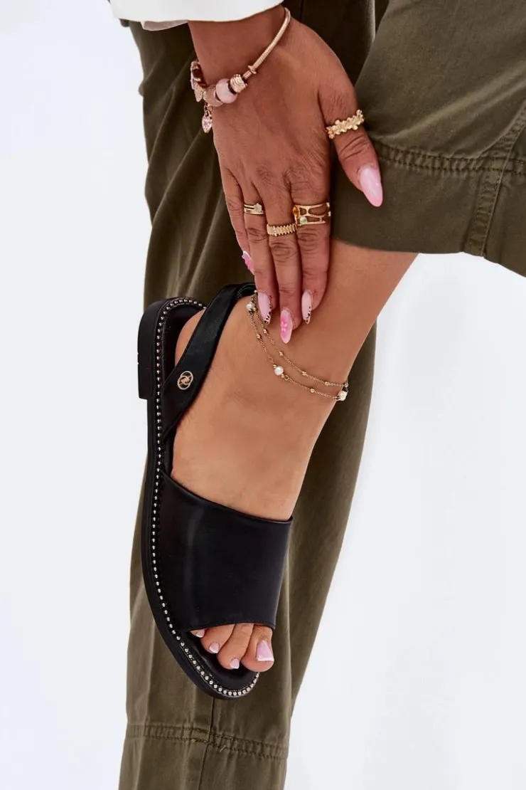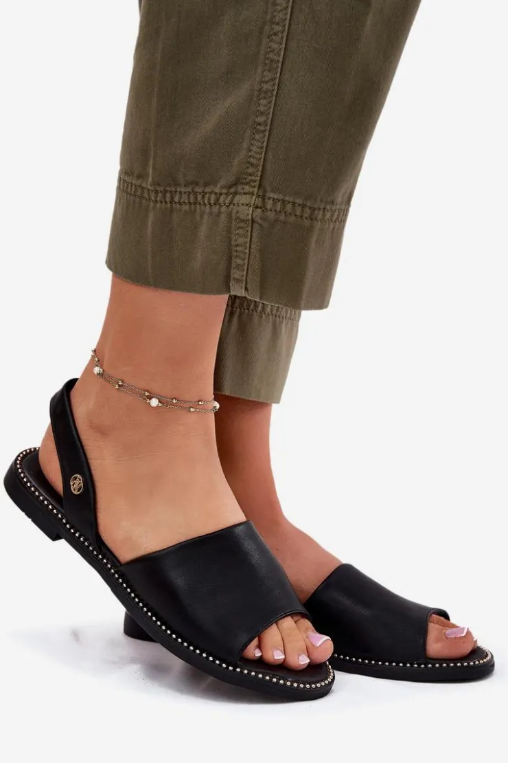 Sandały damskie z eko skóry to elegancka propozycja na ciepłe dni. Osadzone na płaskim obcasie, zapewniają wygodę i komfort przez cały dzień. Na pasku z tyłu znajduje się subtelny ozdobny detal, który dodaje uroku. Idealne do sukienek, spódnic oraz spodni materiałowych, stanowią doskonałe uzupełnienie letnich outfitów. Przy wyborze rozmiaru prosimy kierować się tabelą rozmiarów.
