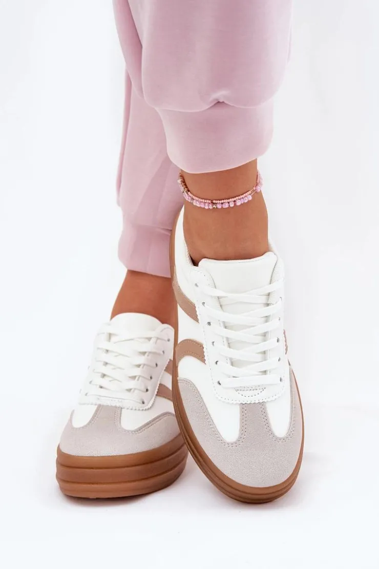 Damskie sneakersy wykonane z ekologicznej skóry. Osadzone na platformie, co wizualnie wysmukli sylwetkę. Zaokrąglone noski gwarantują komfort przez cały dzień. Wkładka z pianki pokryta materiałem zapewnia odpowiednią amortyzację. Te sneakersy stanowią idealną propozycję do codziennych stylizacji, łącząc funkcjonalność z nowoczesnym wyglądem. Przy wyborze rozmiaru prosimy kierować się tabelą rozmiarów.