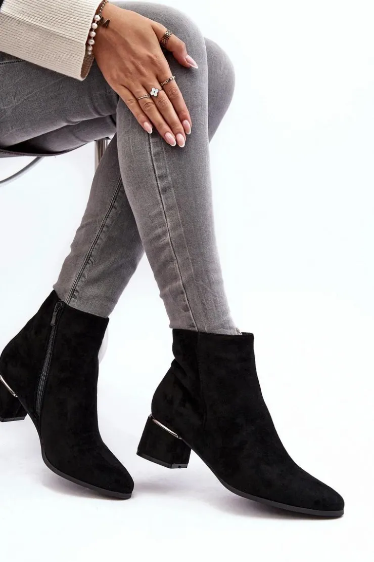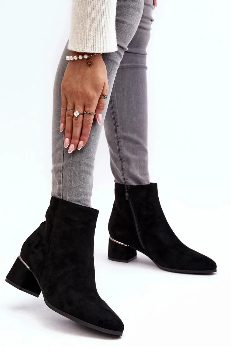 Damskie botki wykonane z eko zamszu. Osadzone na obcasie w postaci niskiego klocka. Noski w migdał. Cholewka za kostkę. Środek ocieplony kocem obuwniczym. Model ten zapinany jest na suwak z boku. Nad obcasem lustrzana, złota ozdoba. Przy wyborze rozmiaru prosimy sugerować się tabelą rozmiarów.