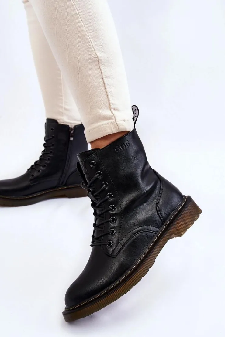 Klasyczne botki marki GOE zostały wykonane z wysokiej jakości naturalnej skóry. Posiadają sznurowanie oraz suwak z boku cholewki. Botki wewnątrz zostały ocieplone kocem obuwniczym. Model osadzony na płaskim obcasie i delikatnej platformie. Dodatkowo zapiętek jest usztywniany. Idealny model do wielu stylizacji! Przy wyborze rozmiaru prosimy sugerować się tabelą rozmiarów.
