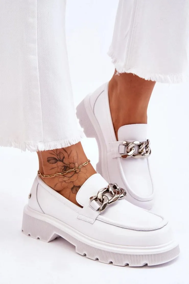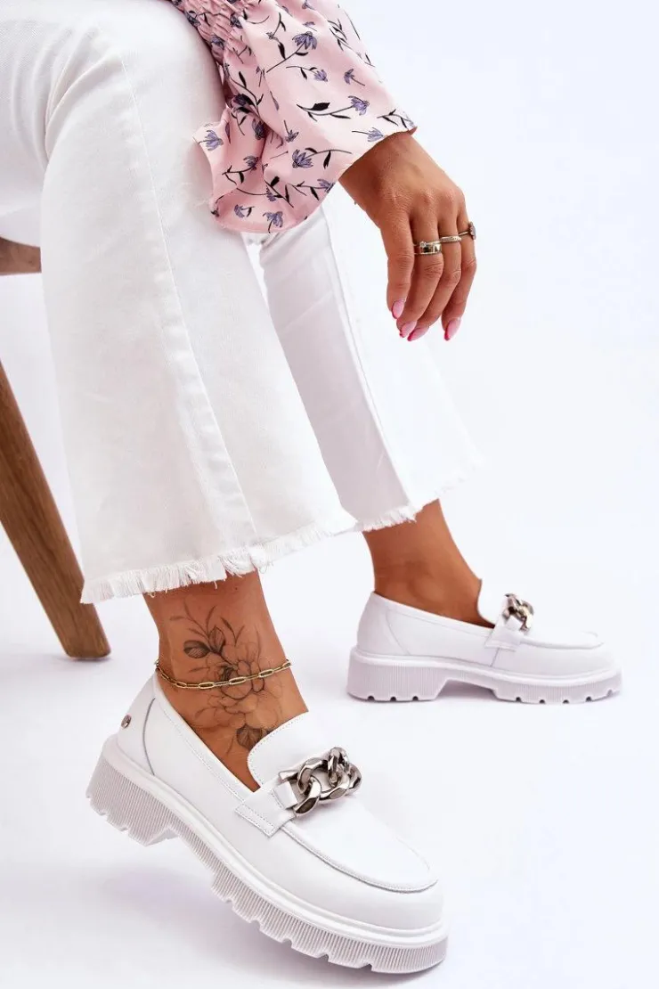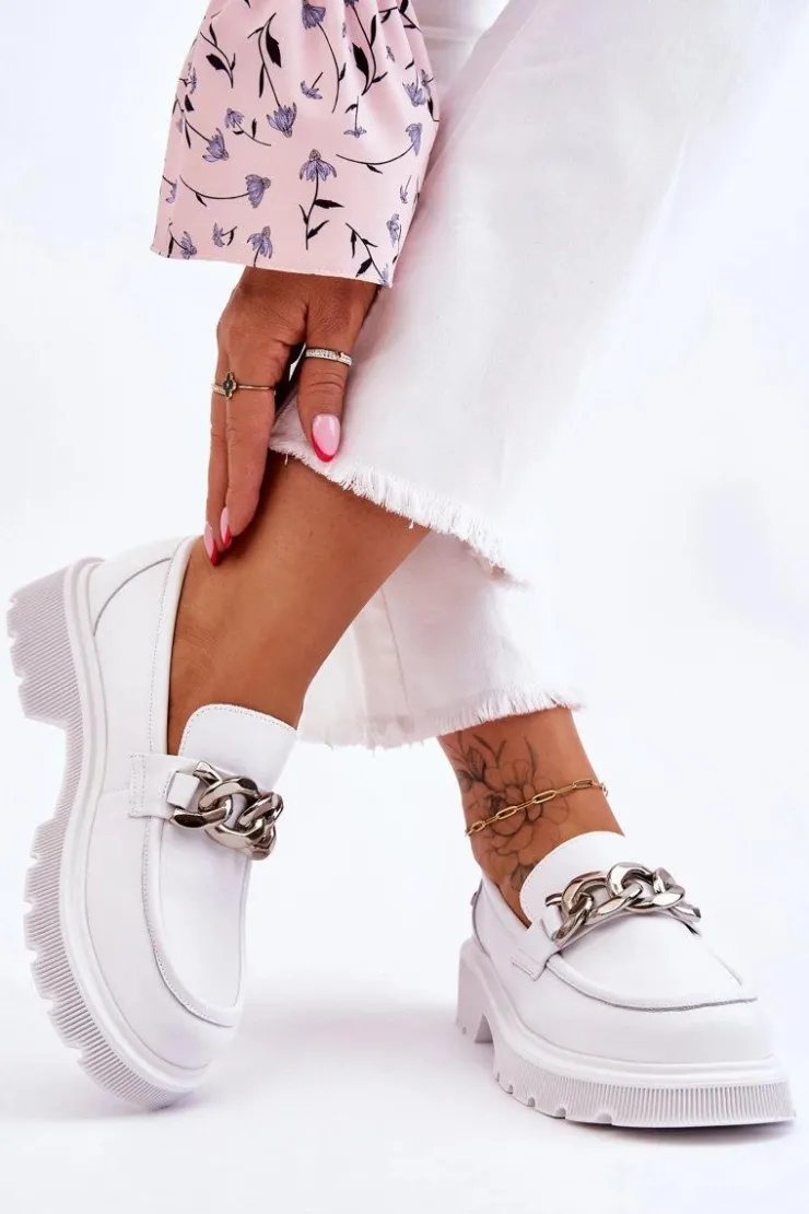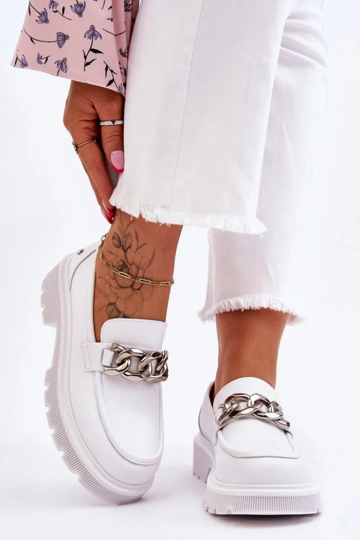 Piękne, damskie mokasyny zostały wykonane z naturalnej skóry. Model ten został ozdobiony łańcuchem z tworzywa. Mokasyny osadzono na płaskim obcasie i platformie. Podeszwa wykonana z gumowego tworzywa jest antypoślizgowa. Wkładka w tych mokasynach jest miękka i wygodna podczas użytkowania. Przy wyborze rozmiaru prosimy sugerować się tabelą rozmiarów.