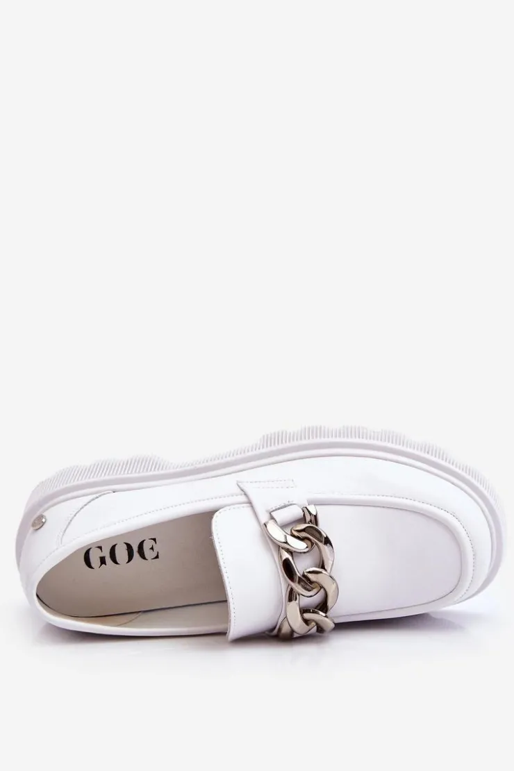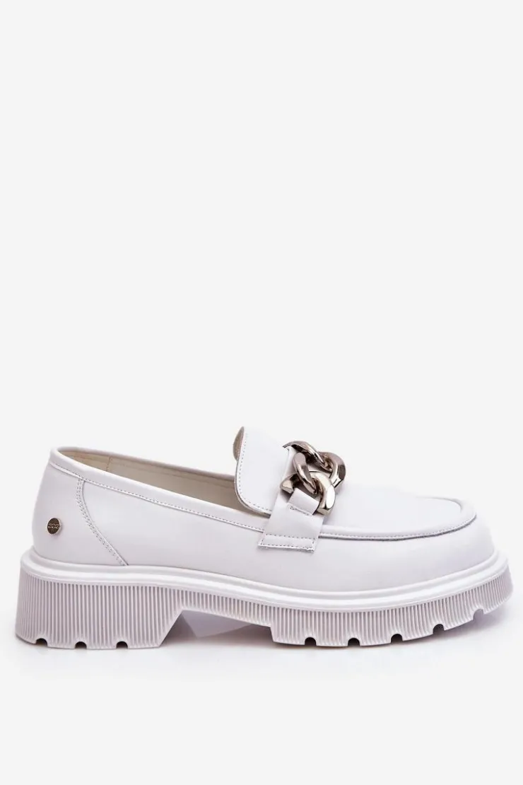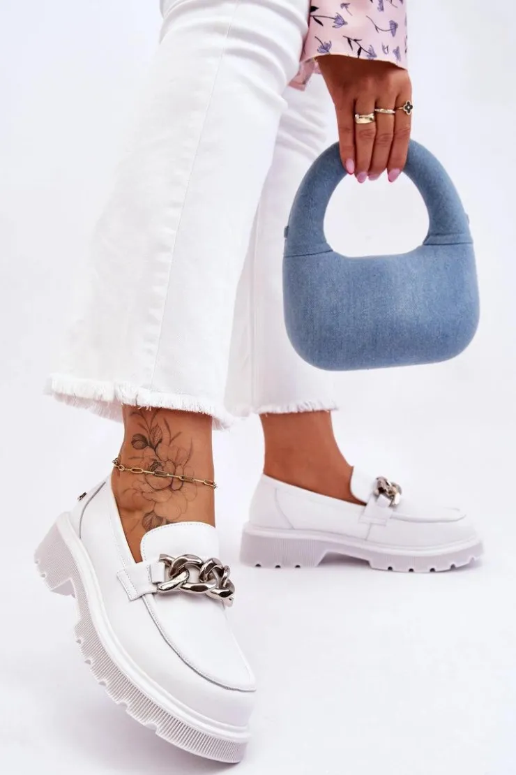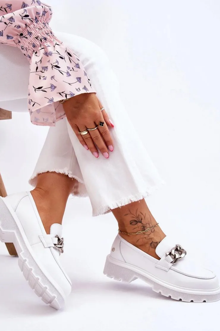 Piękne, damskie mokasyny zostały wykonane z naturalnej skóry. Model ten został ozdobiony łańcuchem z tworzywa. Mokasyny osadzono na płaskim obcasie i platformie. Podeszwa wykonana z gumowego tworzywa jest antypoślizgowa. Wkładka w tych mokasynach jest miękka i wygodna podczas użytkowania. Przy wyborze rozmiaru prosimy sugerować się tabelą rozmiarów.